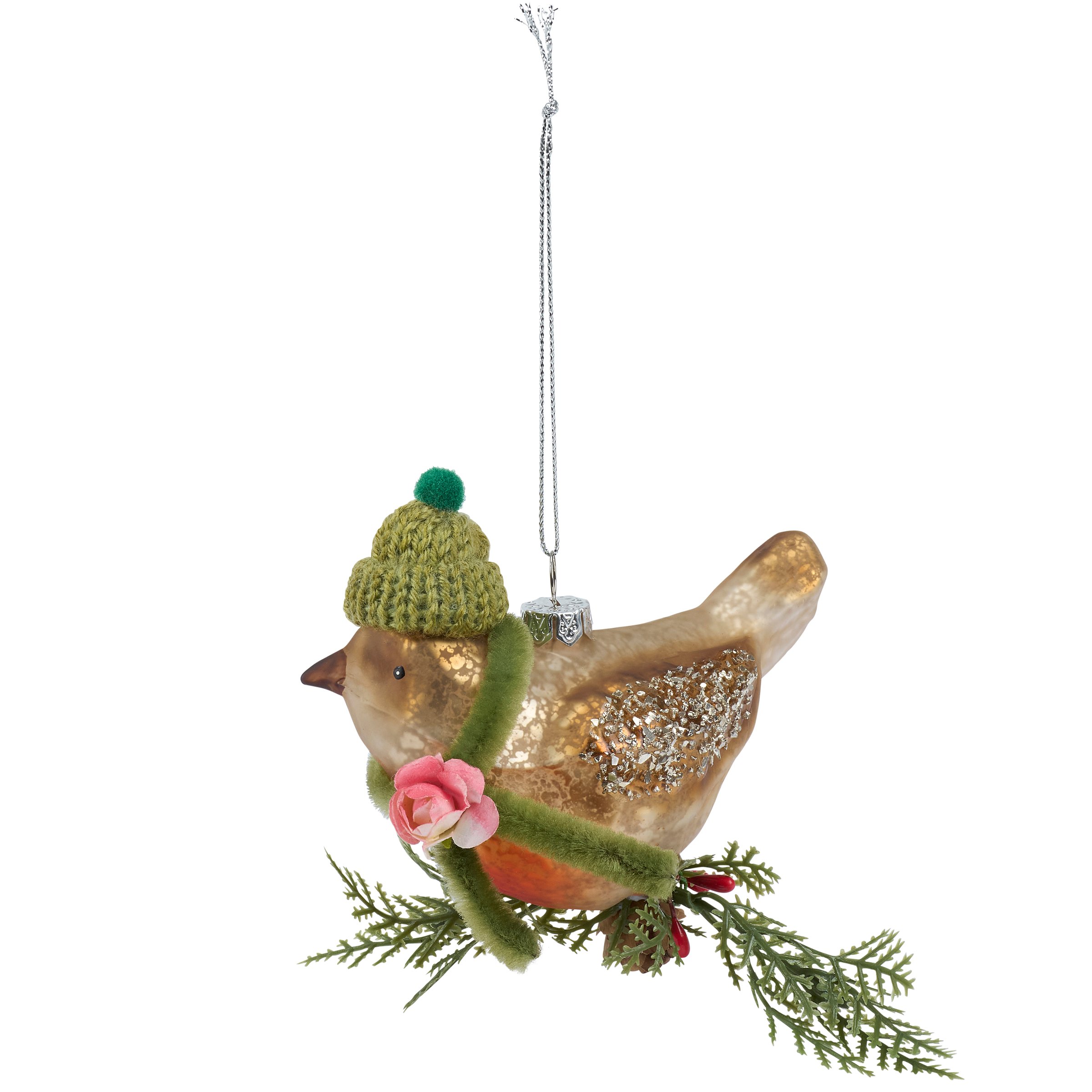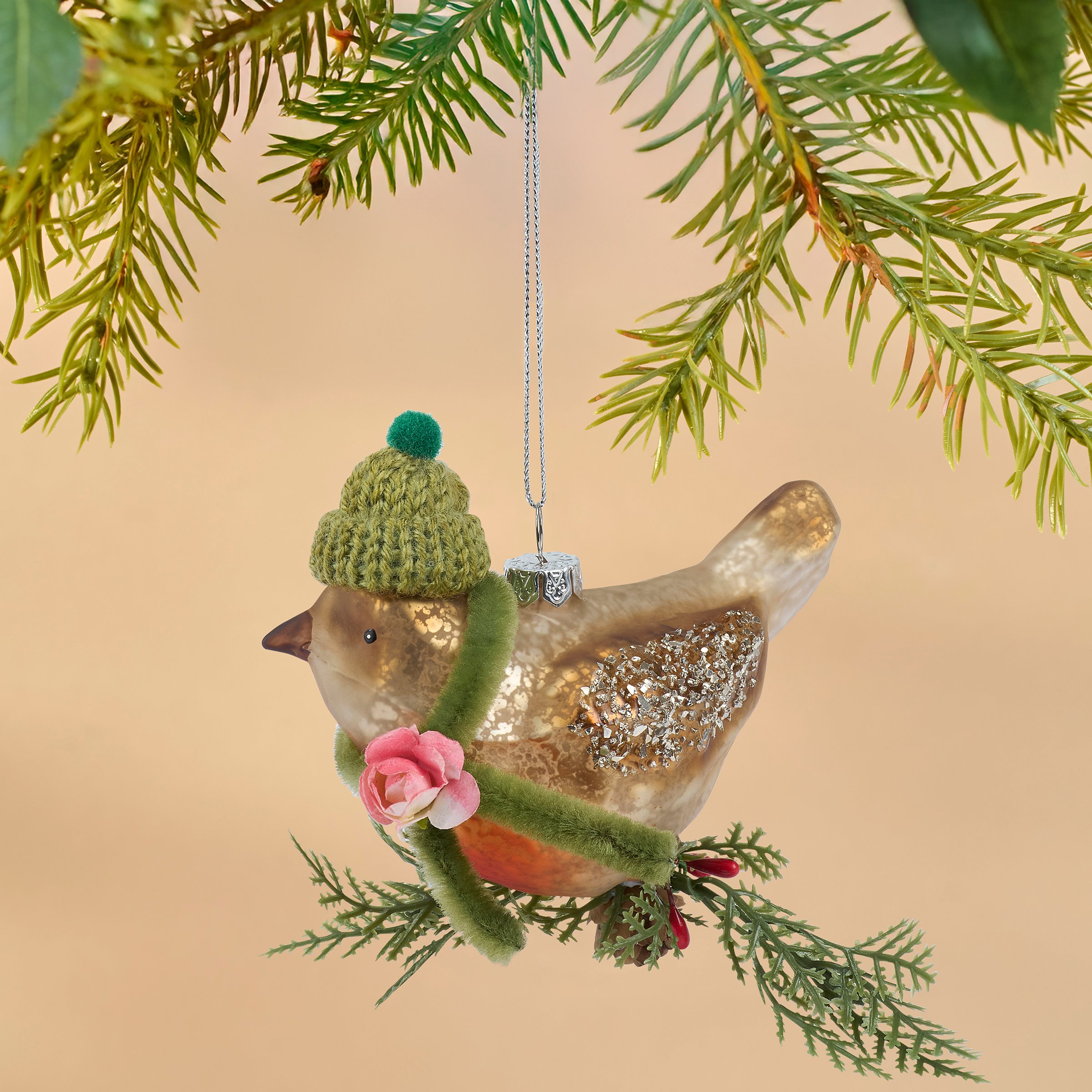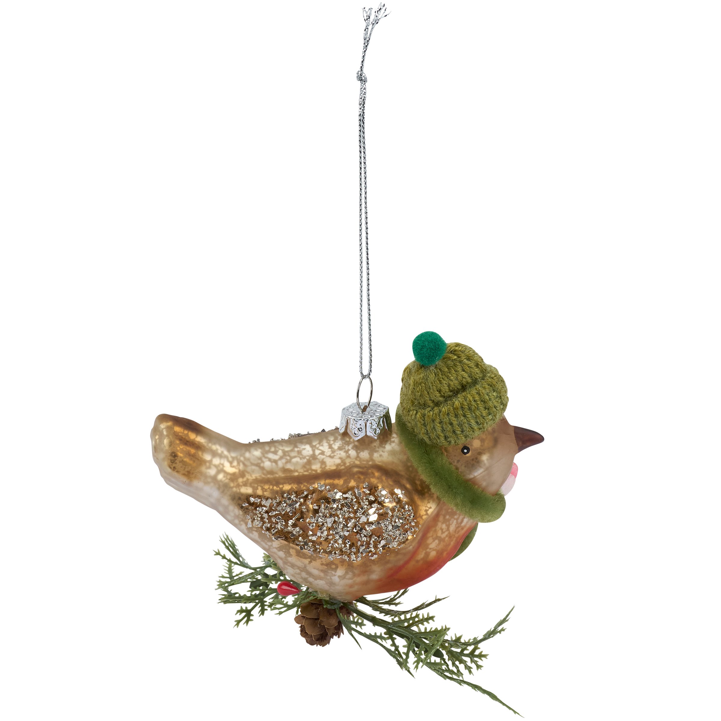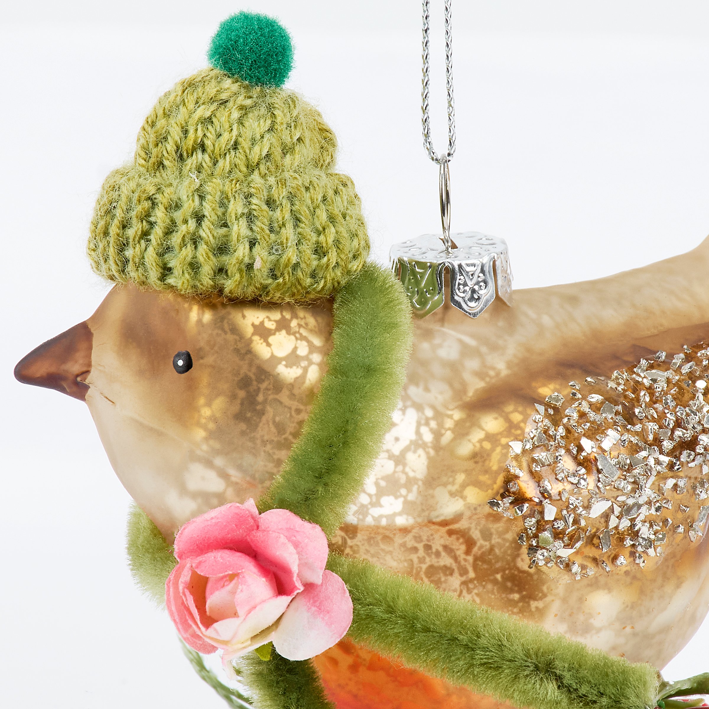 A glass ornament from our Christmas Collection displaying a robin inspired design featuring painted details, glitter accents, and crafted accessories including a knit beanie and pipe cleaner scarf. Our glass Beanie Robin ornament is ready to hang for display via the included top loop and string hanger. A vintage gift perfect for adding personality to a Christmas tree or for everyday nature displays.