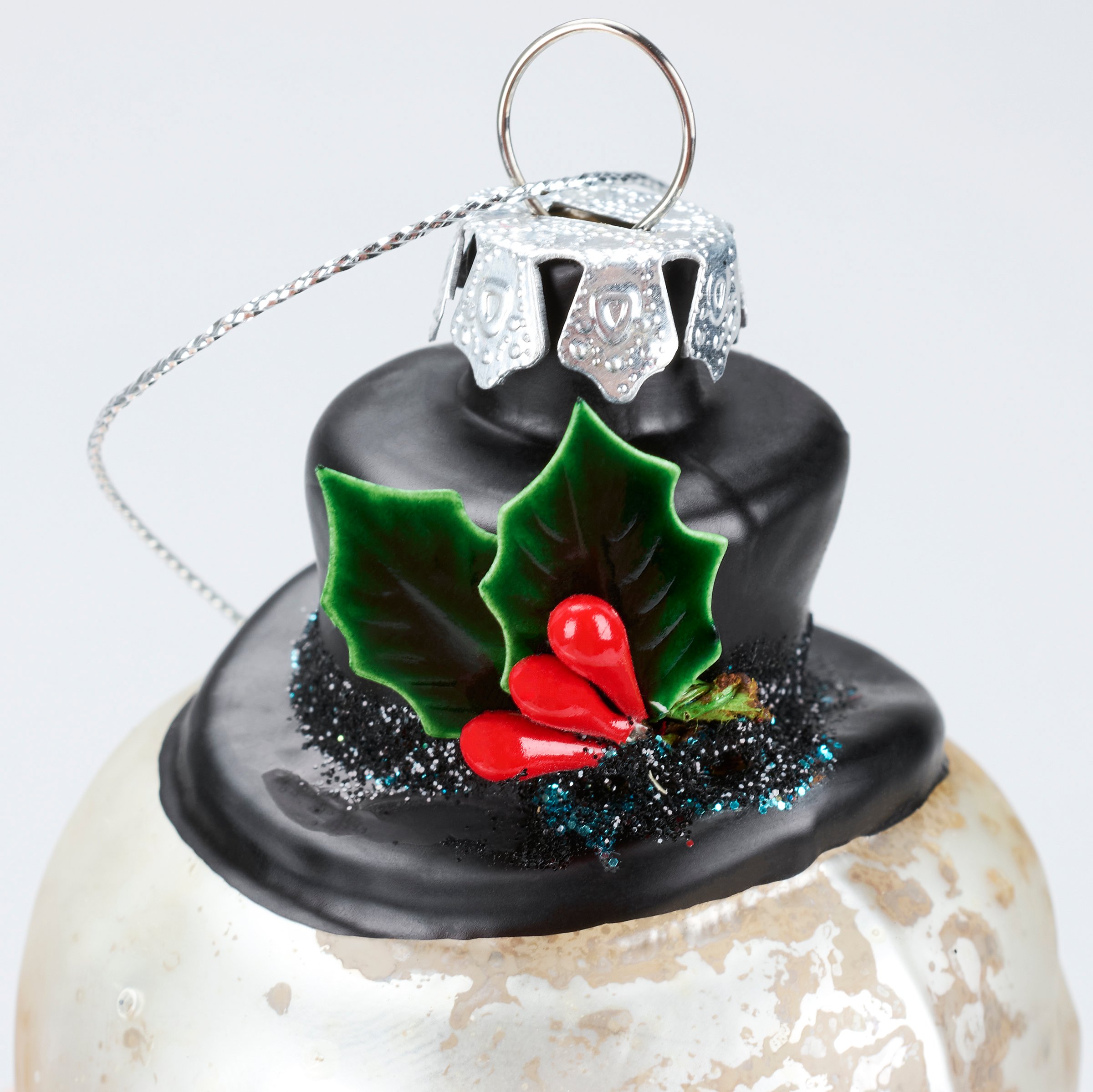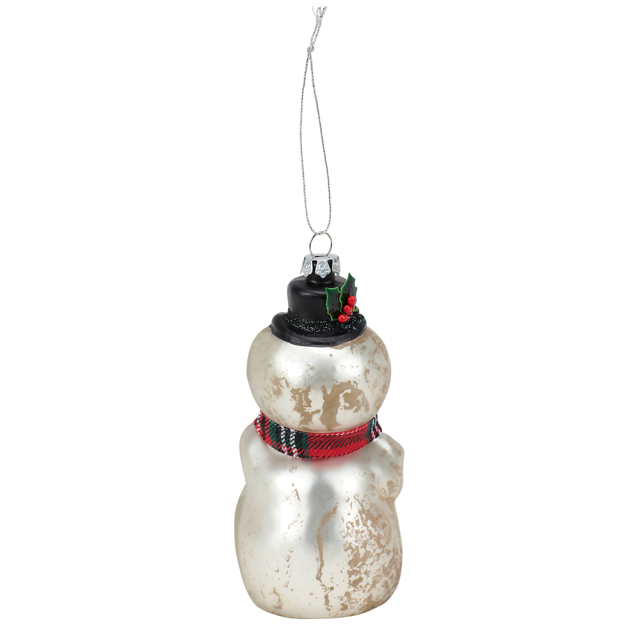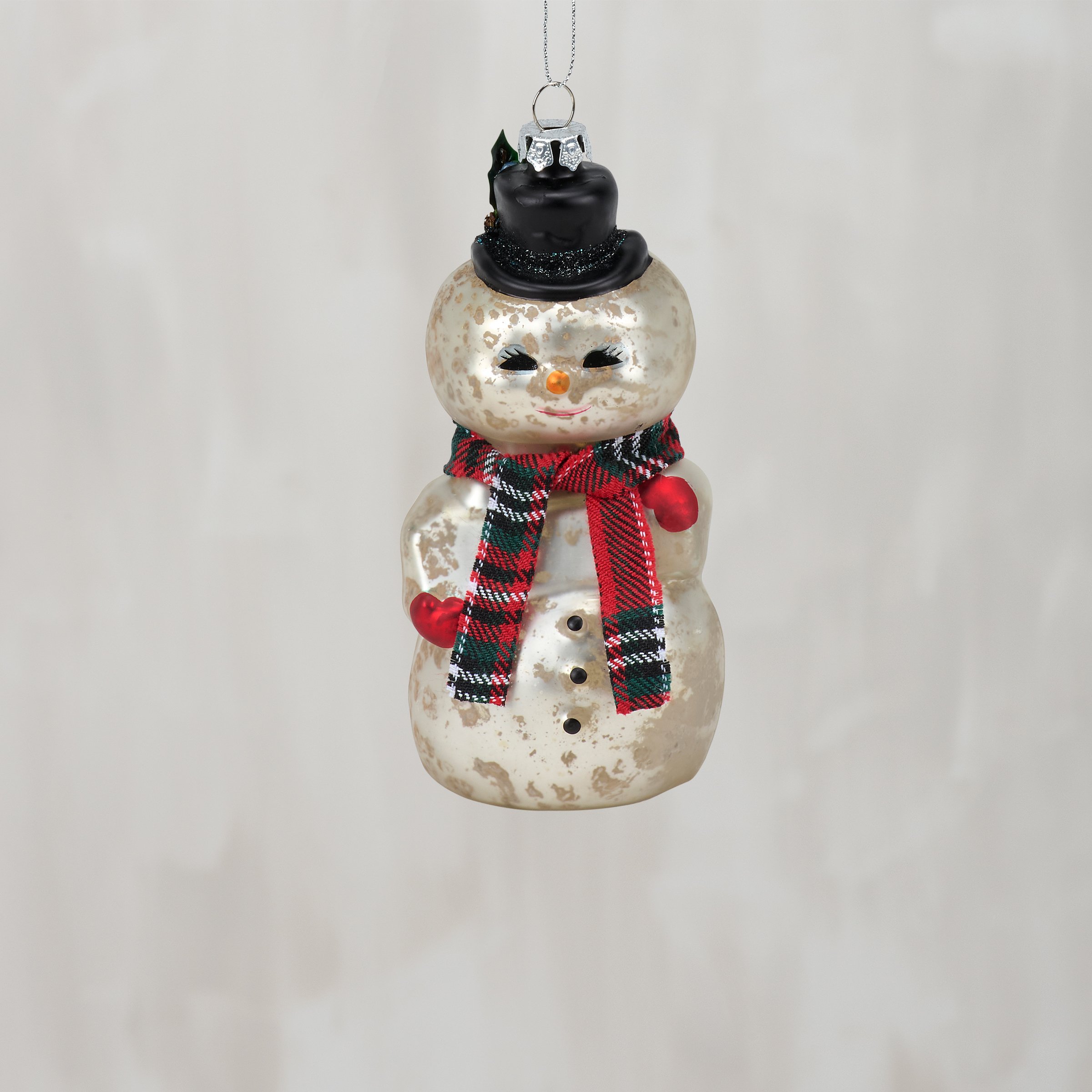 A glass ornament from our Christmas Collection displaying a retro Frosty the snowman inspired design featuring painted details, glitter accents, and crafted accessories including a fabric plaid scarf. Our glass Frosty ornament is ready to hang for display via the included top loop and string hanger. A retro gift perfect for adding personality to a Christmas tree or for snowman themed displays.