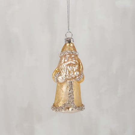 A glass ornament from our Christmas Collection displaying a vintage Santa design in gold outfit with glitter accents. Our glass Gold Santa ornament is ready to hang via the top loop and string. A vintage seasonal home accent perfect for a Christmas tree or for gifting.