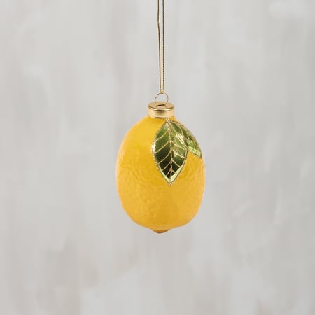 A glass ornament from our Christmas Collection displaying a design of a lemon with green leaves and glitter accents. Our glass Lemon ornament is ready to hang via the included top loop. A fun seasonal home accent perfect for a Christmas tree or for gifting.