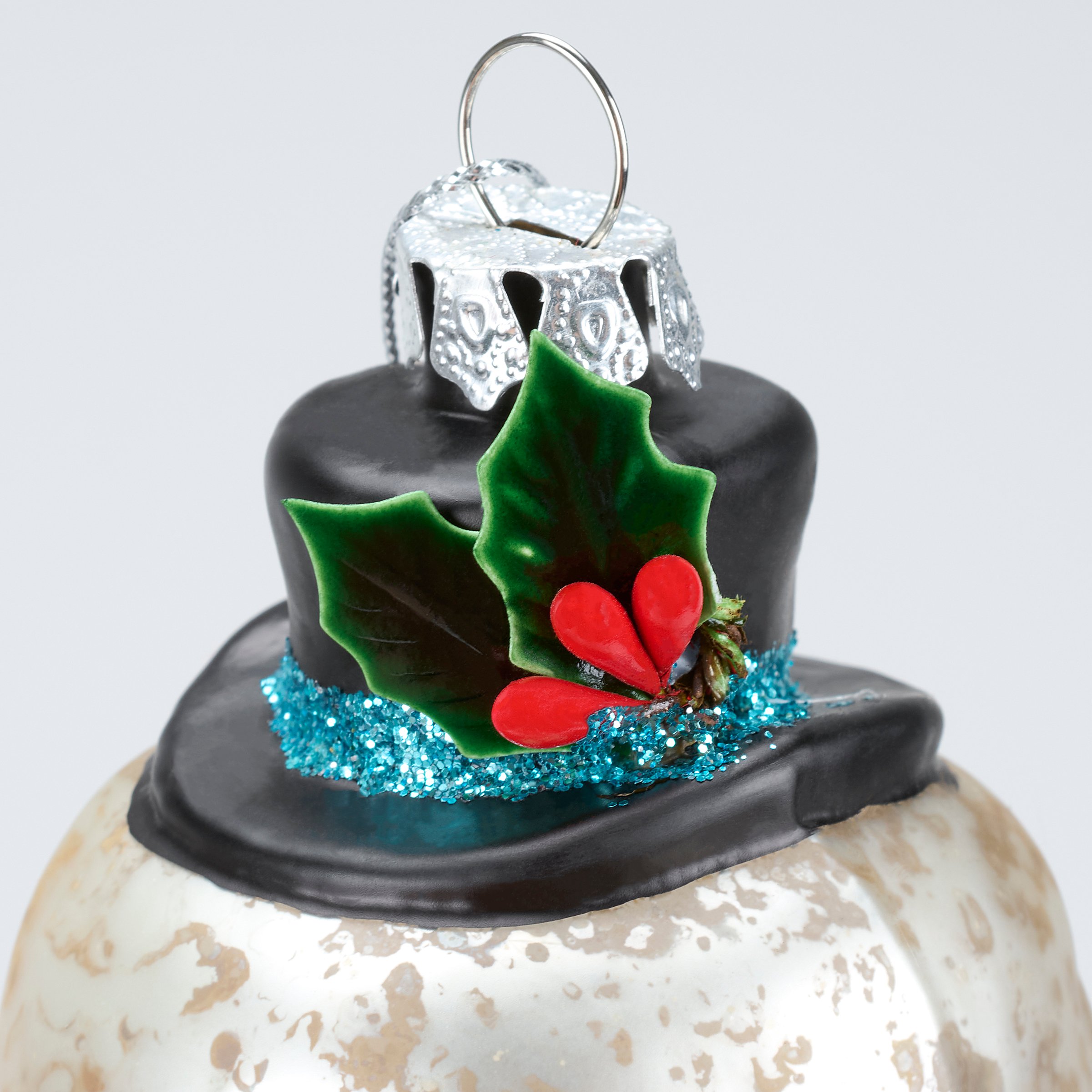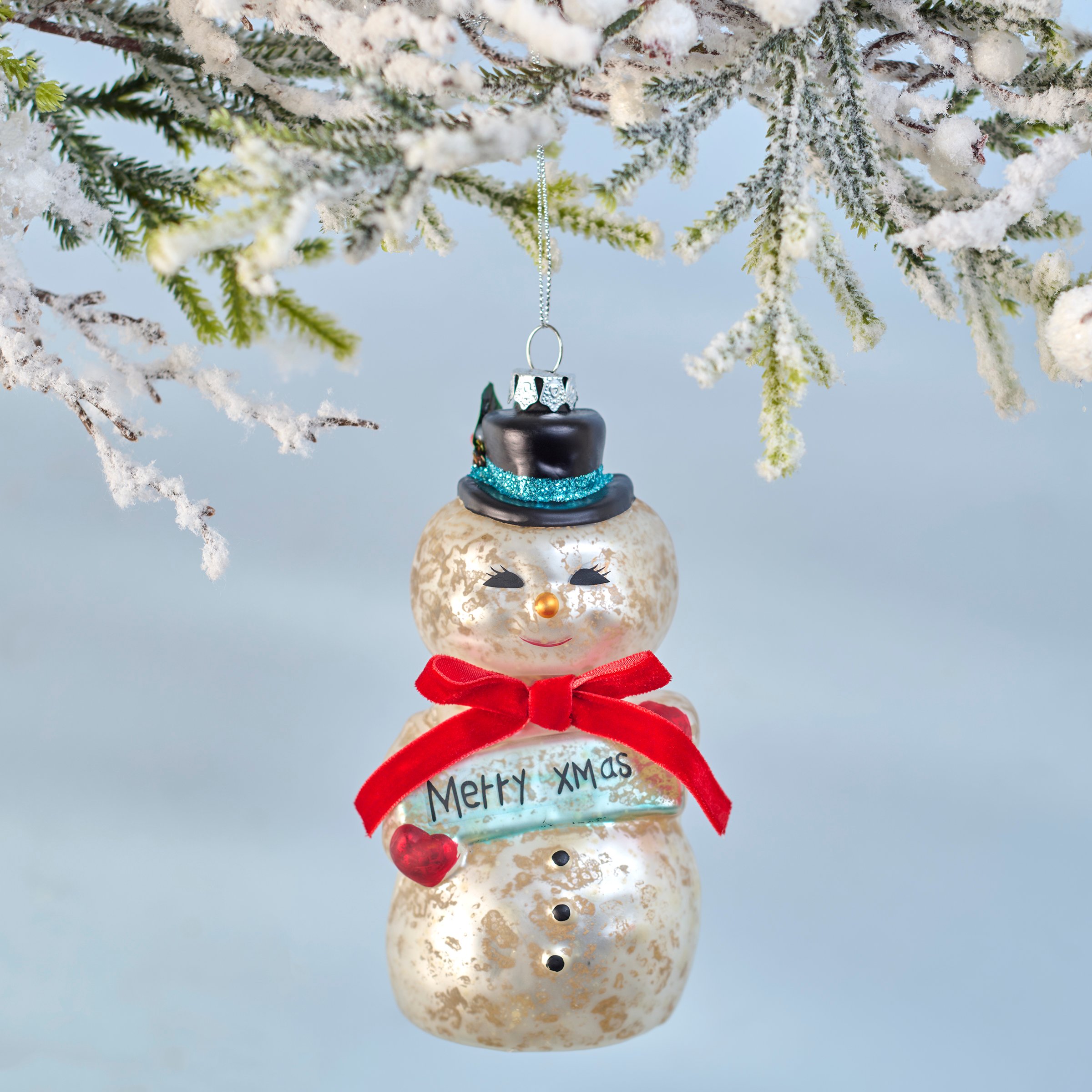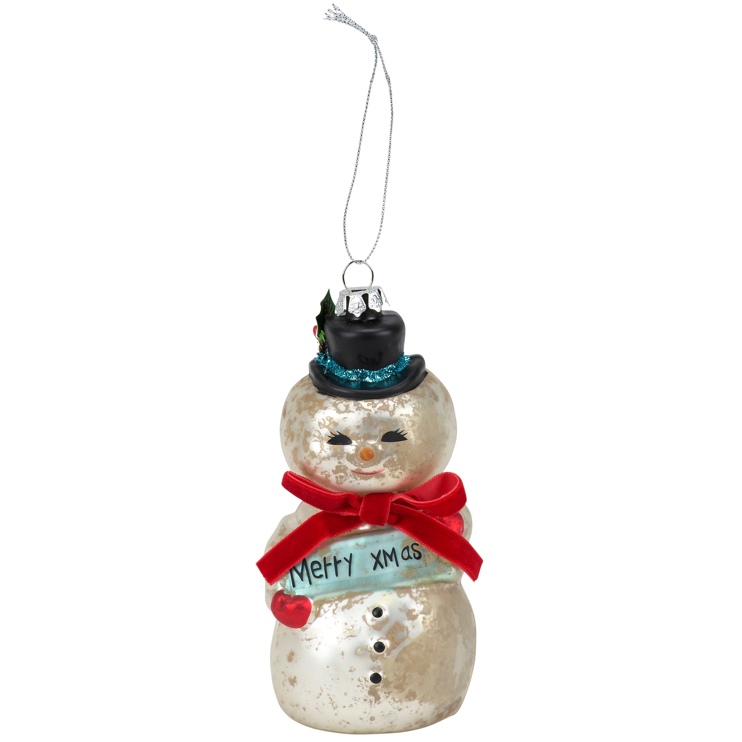 A glass ornament from our Christmas Collection displaying a retro inspired design of a snowman holding a "Merry Xmas" sign featuring painted details, glitter accents, and crafted accessories including a ribbon scarf. Our glass Merry Xmas Snowman ornament is ready to hang for display via the included top loop and string hanger. A retro gift perfect for adding personality to a Christmas tree or for snowman themed displays.