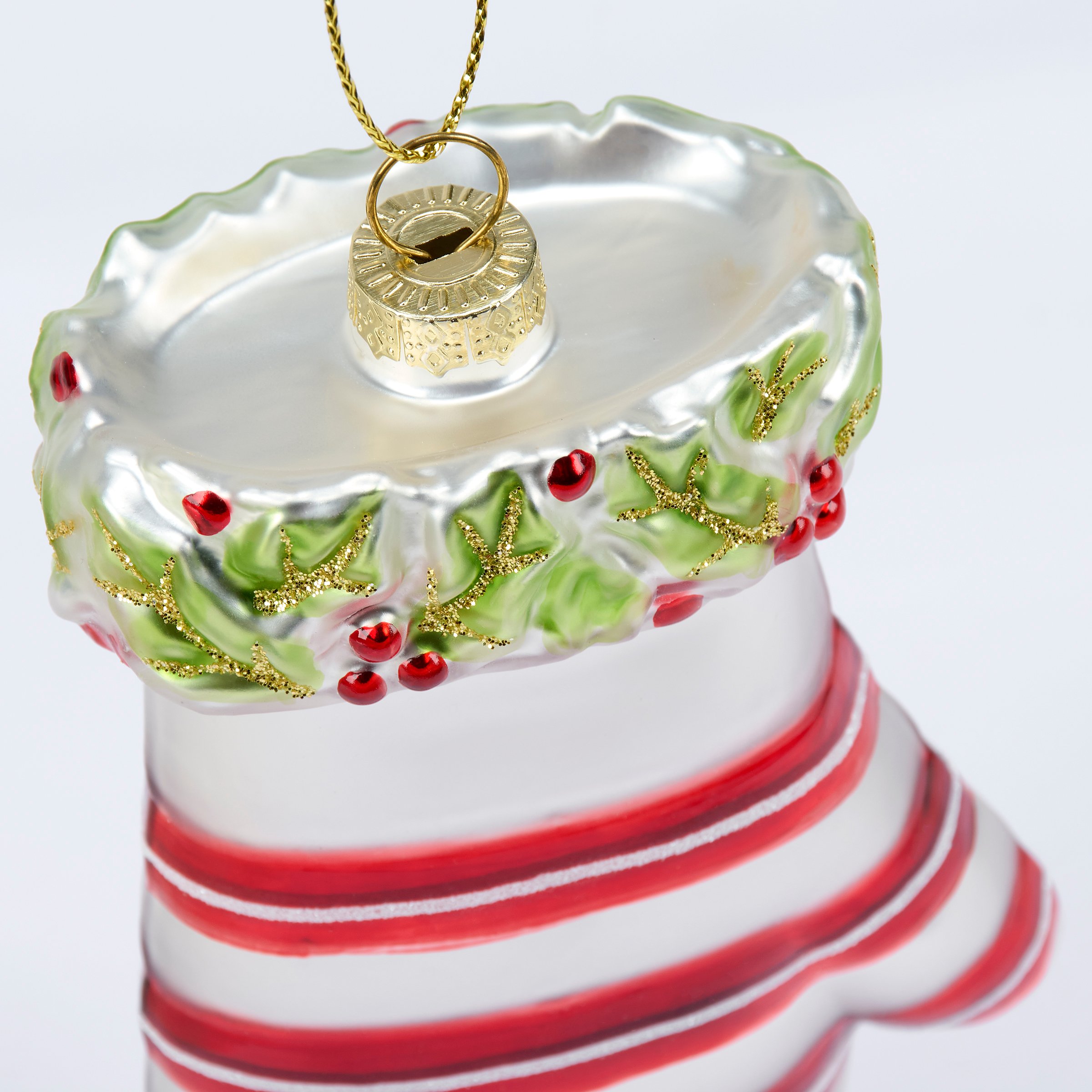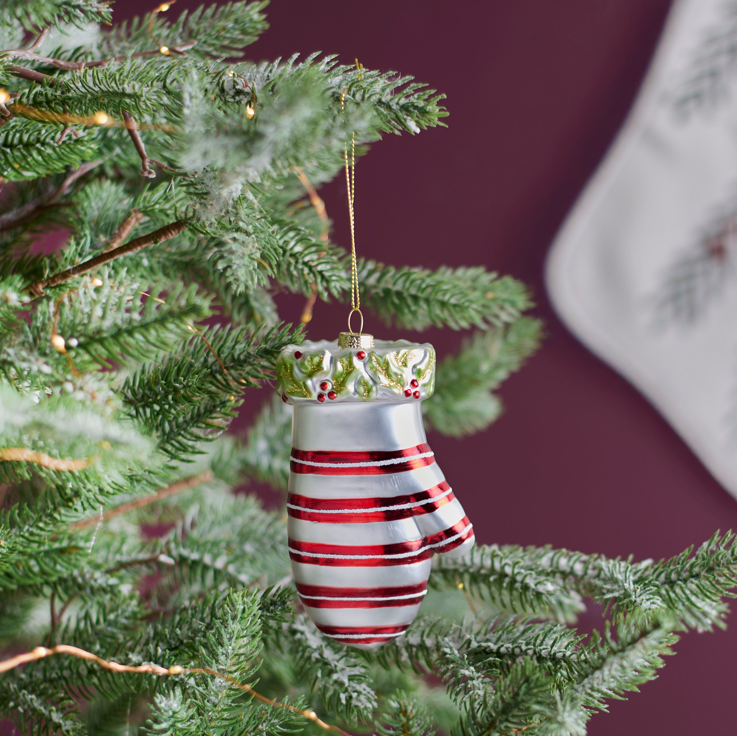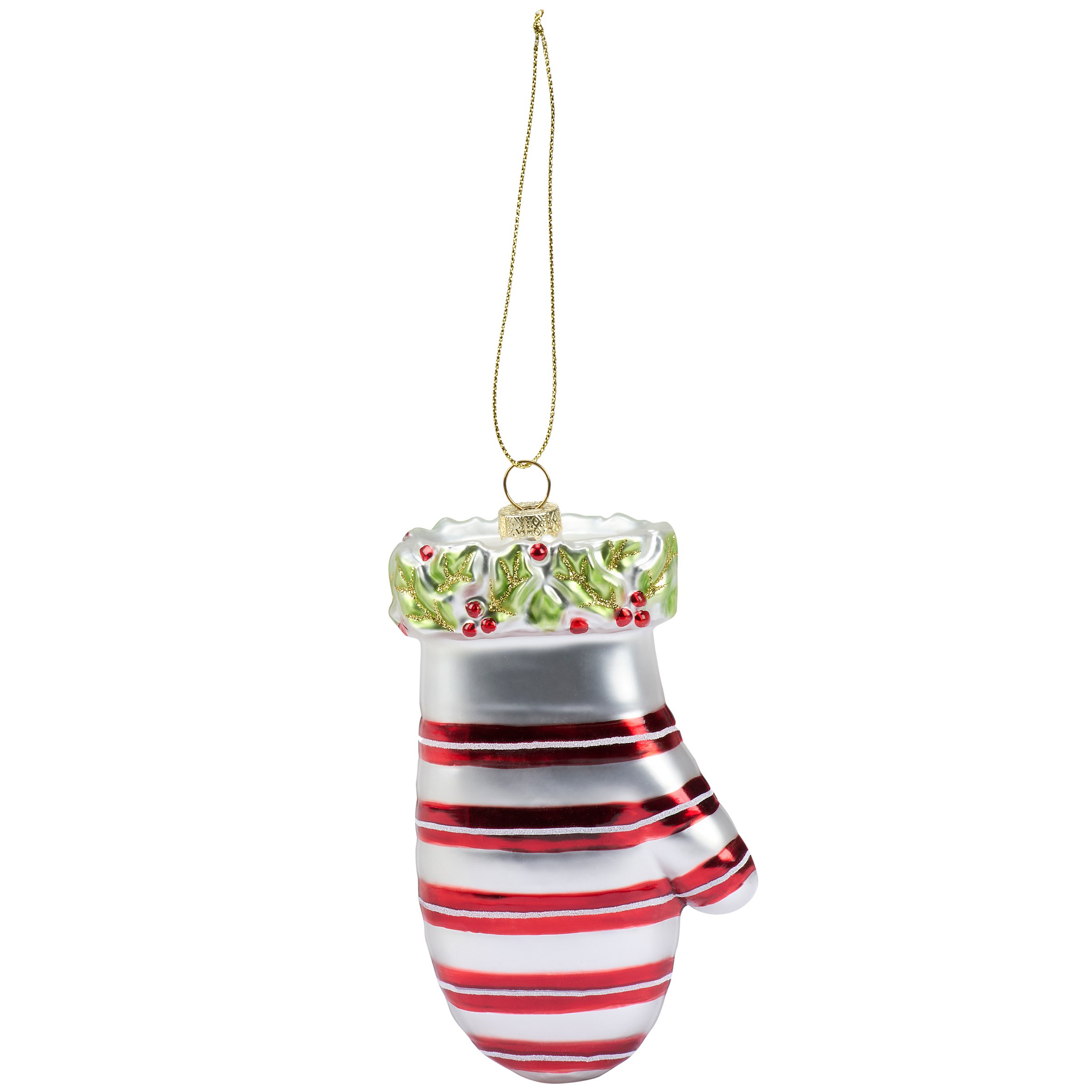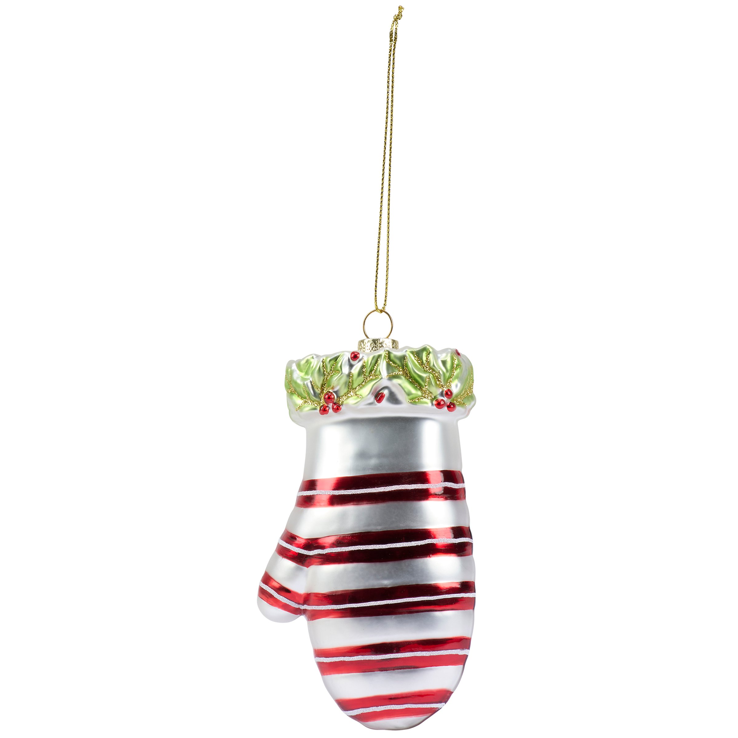 A glass ornament from our Christmas Collection displaying a vintage mitten inspired design featuring painted details and glitter accents. Our glass Mitten ornament is ready to hang for display via the included top loop and string hanger. A vintage gift perfect for adding personality to a Christmas tree.