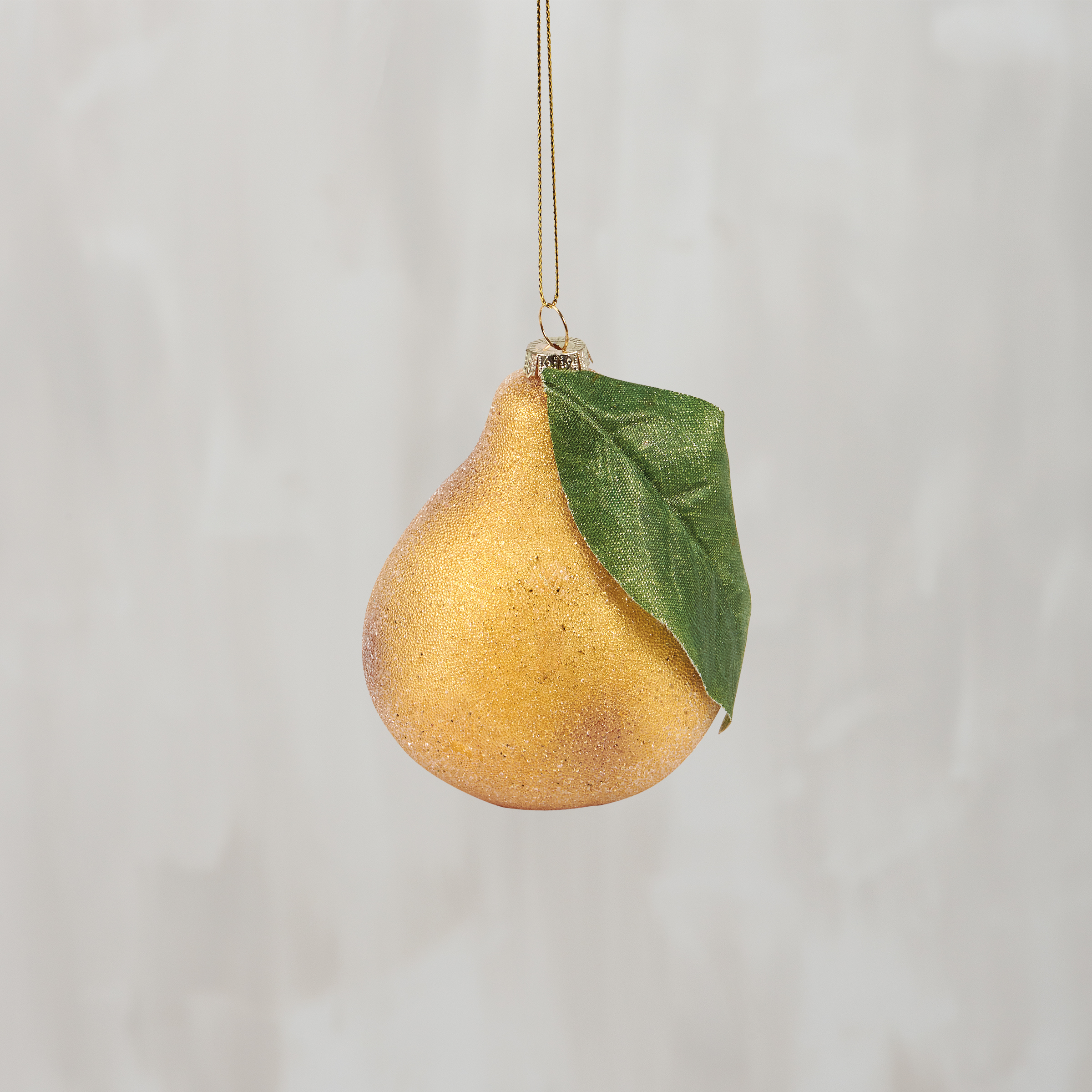A glass ornament from our Christmas Collection displaying a design of a pear with glitter detail and fabric leaf accent. Our glass Pear ornament is ready to hang via the included top loop. A fun seasonal home accent perfect for a Christmas tree or for gifting.