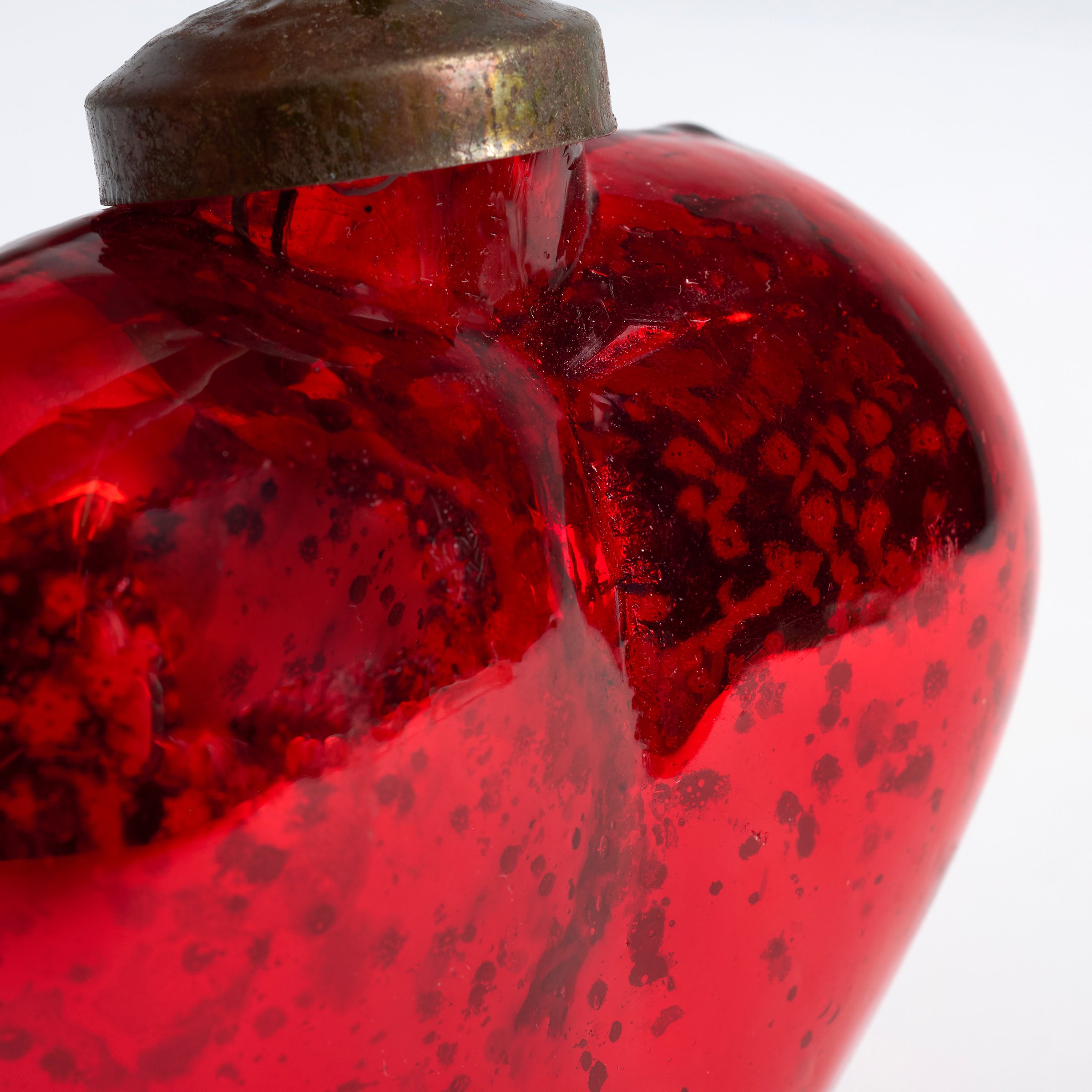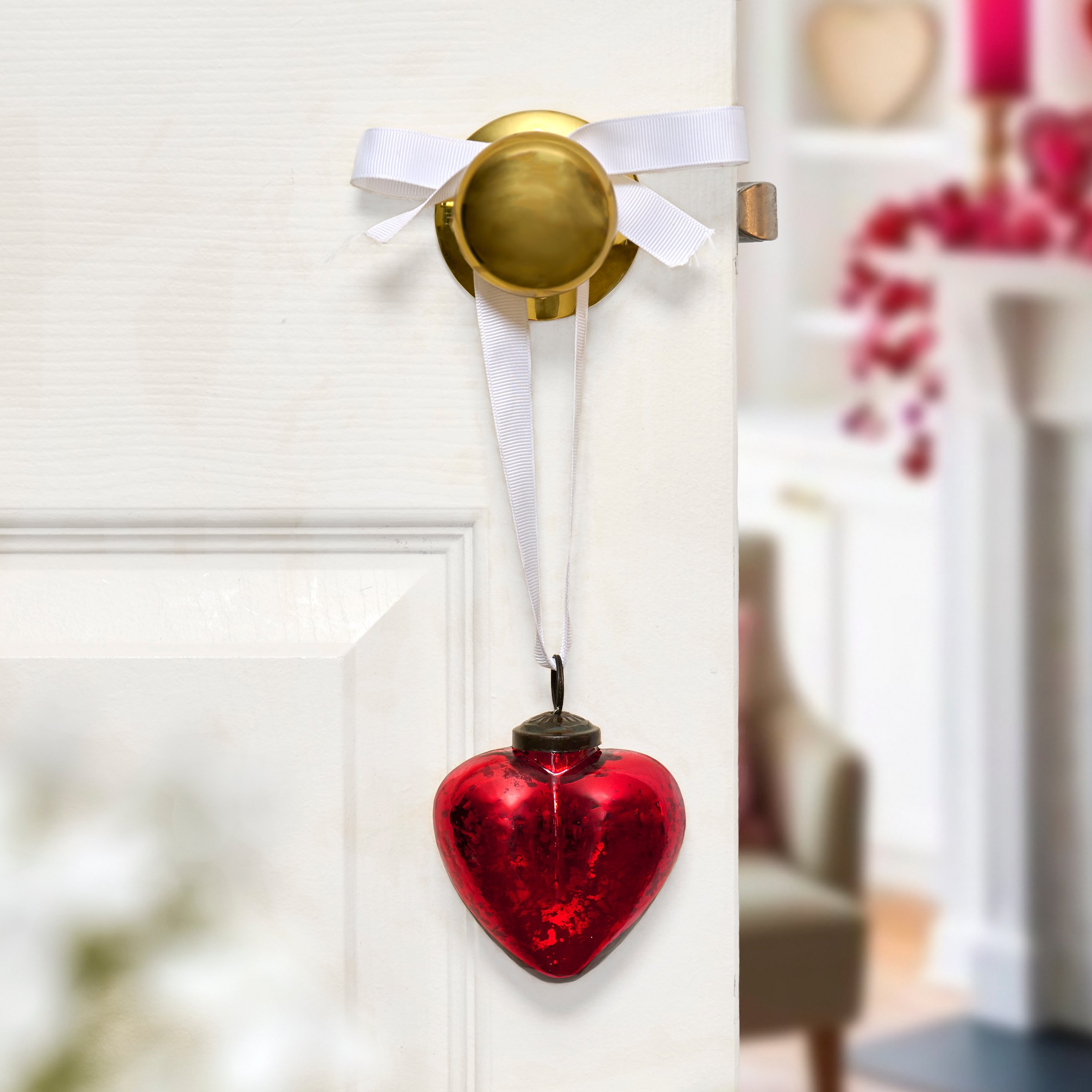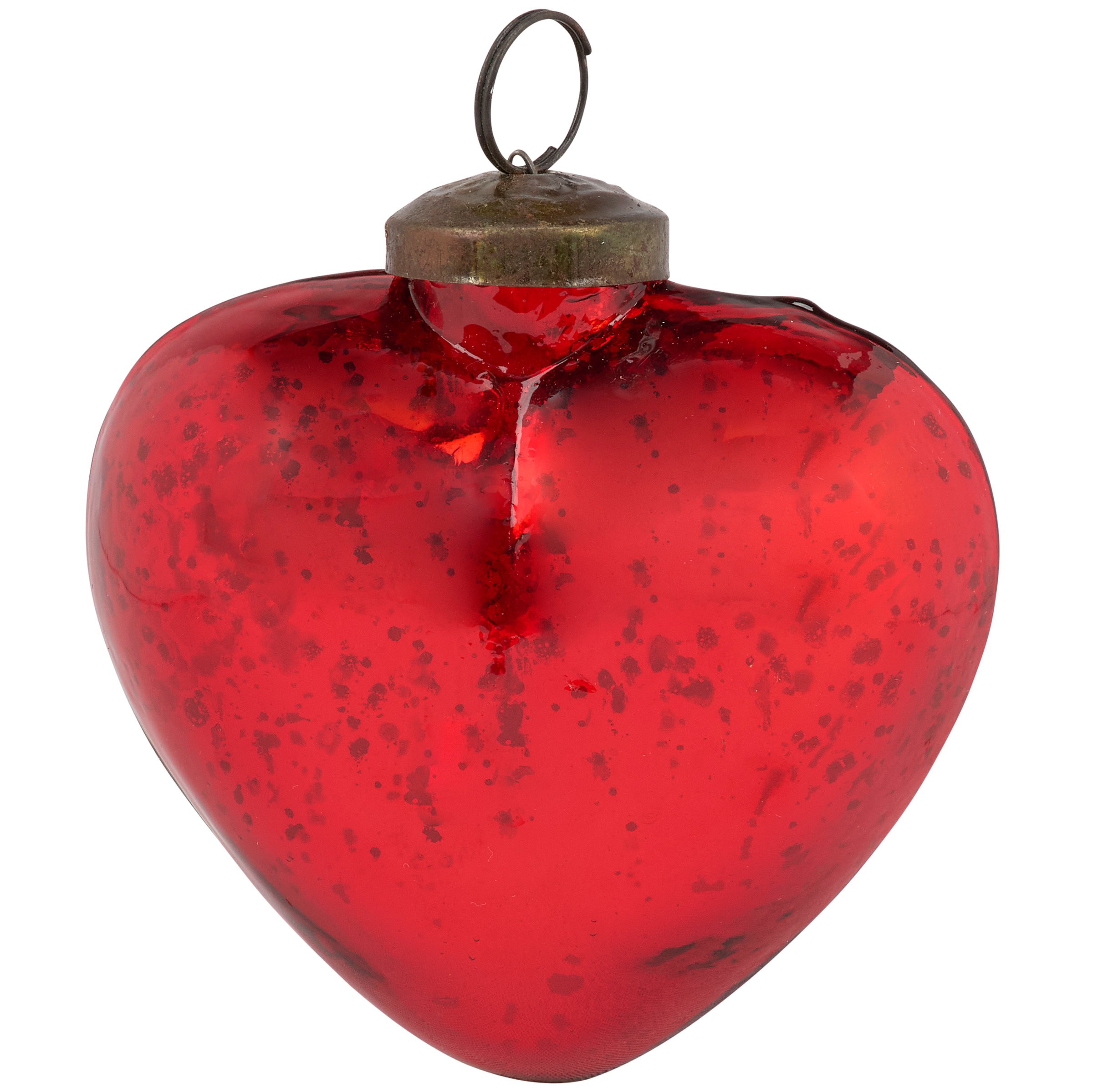 A glass ornament from our Valentine's Day Collection displaying a love heart design with red glass and distressed details. Our glass Red Heart ornament is ready to hang for display via the included top loop and string hanger. A vintage style gift perfect for adding personality to a Christmas tree or for seasonal Valentine's Day displays.