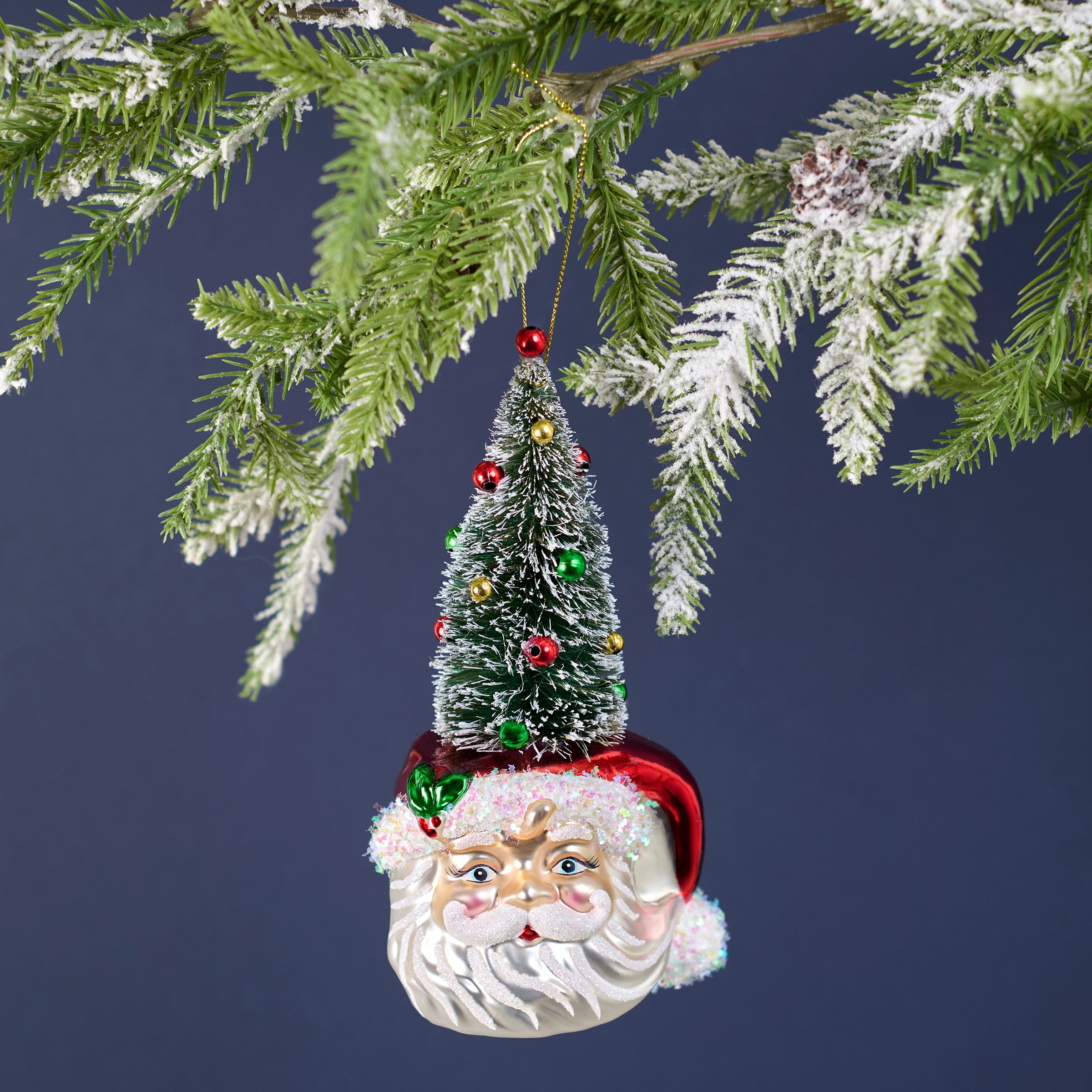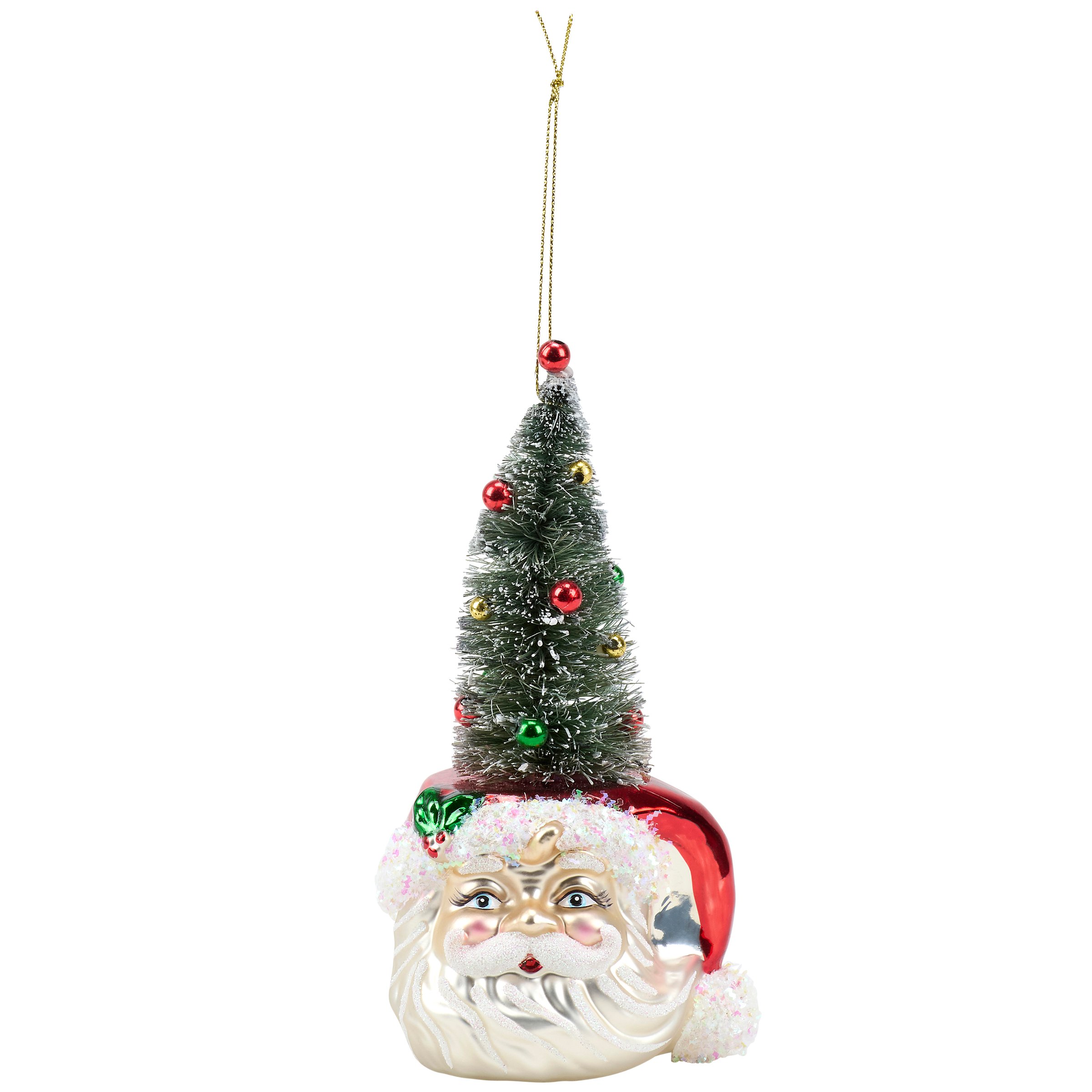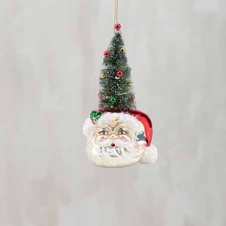 A glass ornament from our Christmas Collection displaying a retro Santa head design featuring painted details and glitter accents as well as a bottle brush Christmas tree on top. Our glass Santa Tree ornament is ready to hang for display via the included top loop and string hanger. A retro gift perfect for adding personality to a Christmas tree or for Santa themed displays.