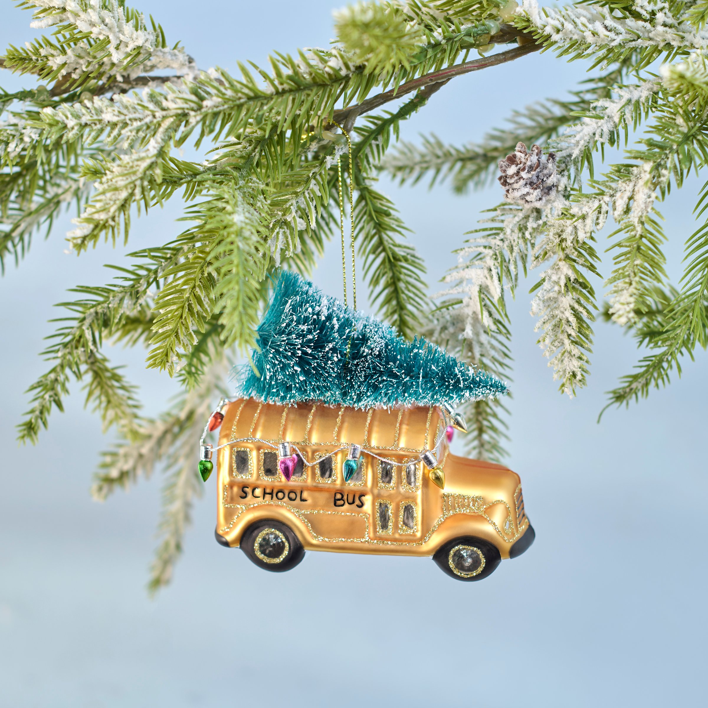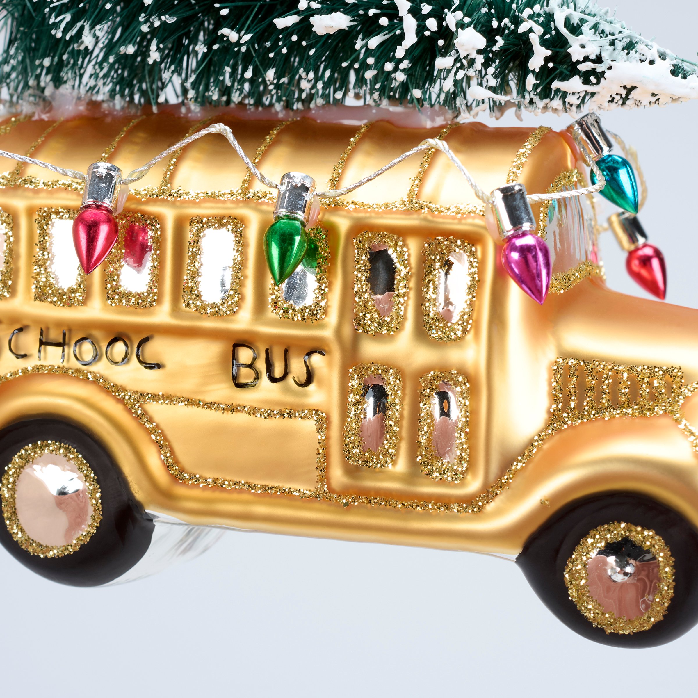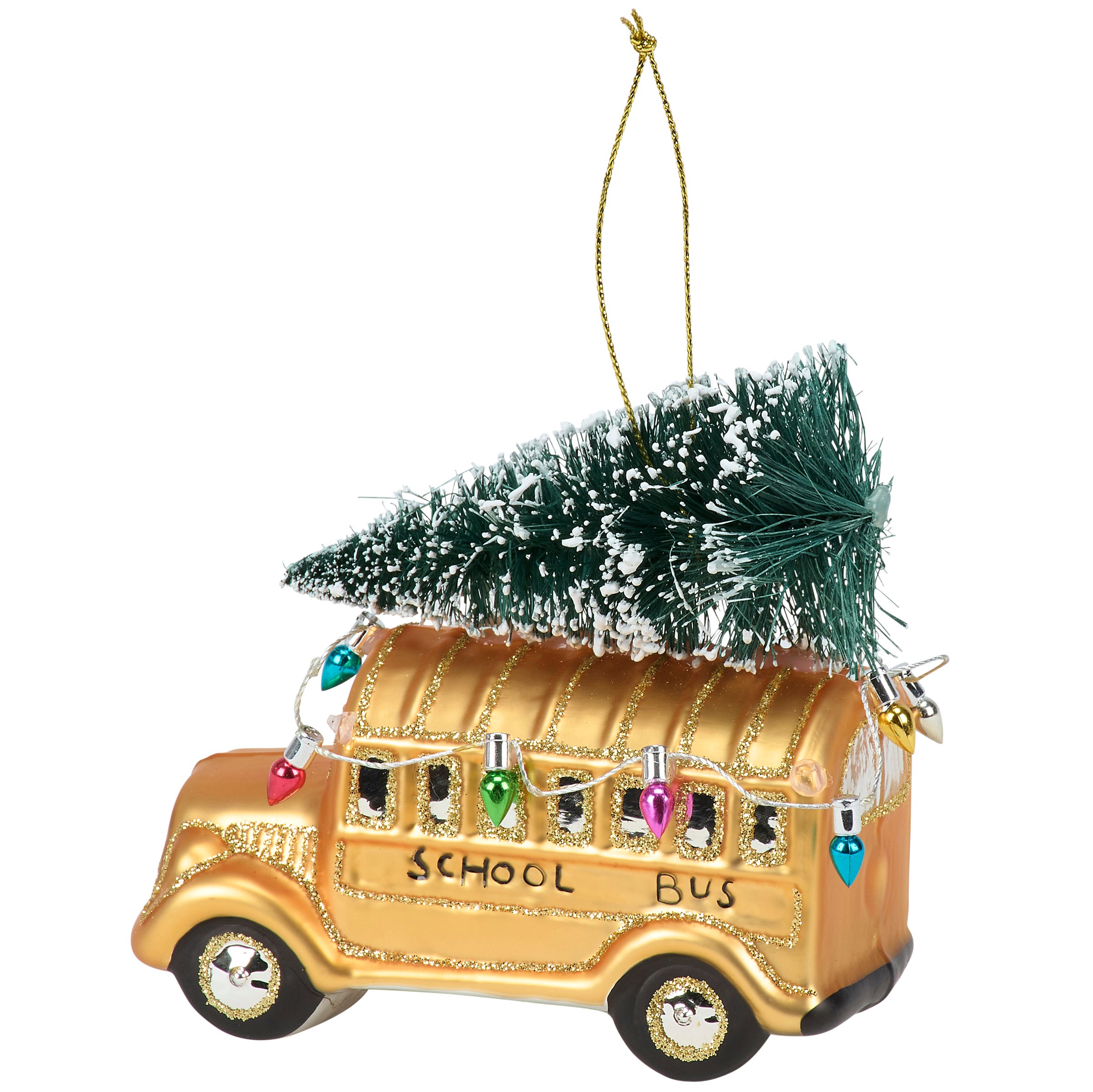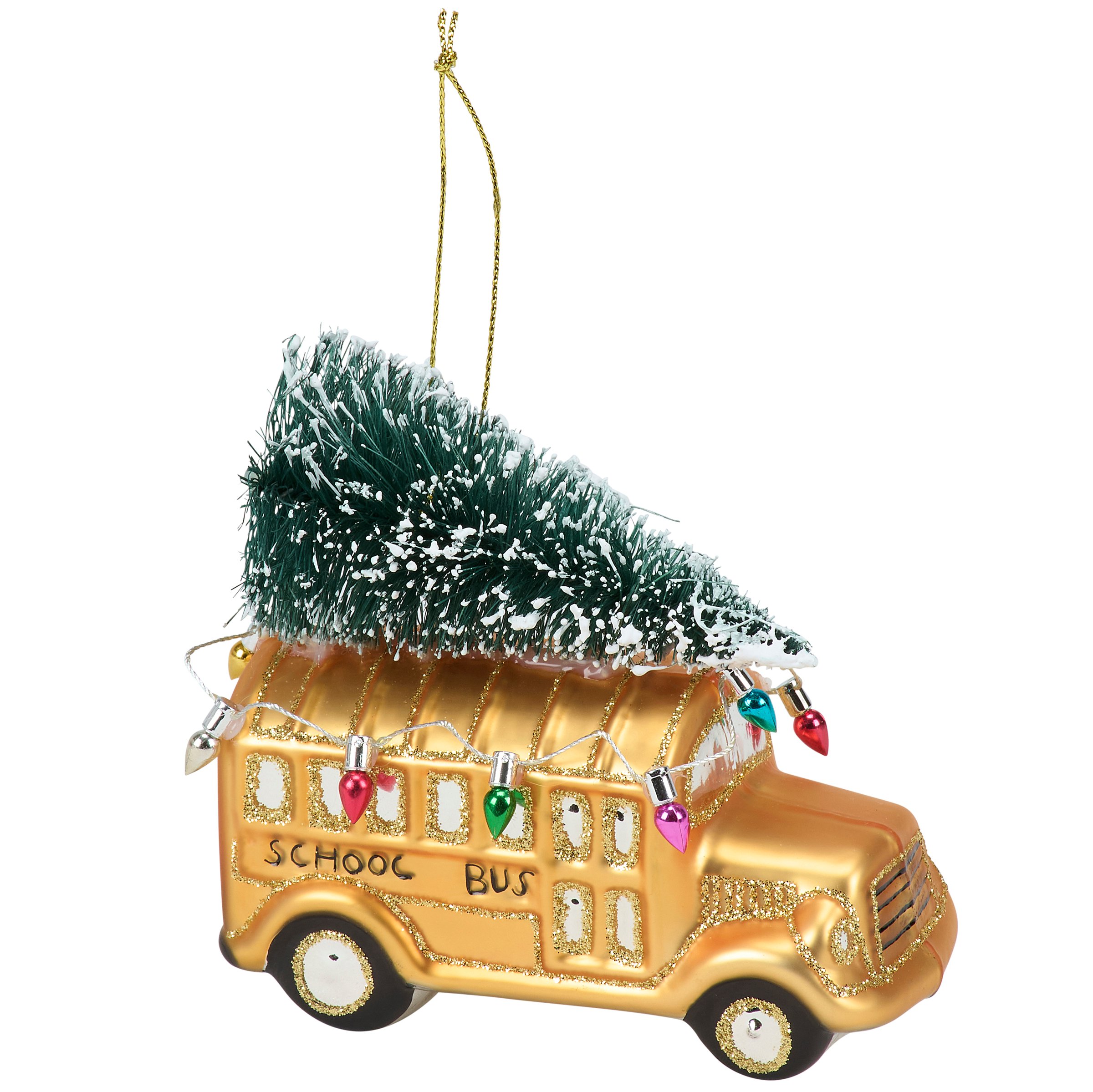 A glass ornament from our Christmas Collection displaying a school bus inspired design featuring painted details and glitter accents as well as a bottle brush tree and Christmas lights on top. Our glass School Bus With Lights ornament is ready to hang for display via the included top loop and string hanger. A vintage gift perfect for adding personality to a Christmas tree or for everyday school themed displays.