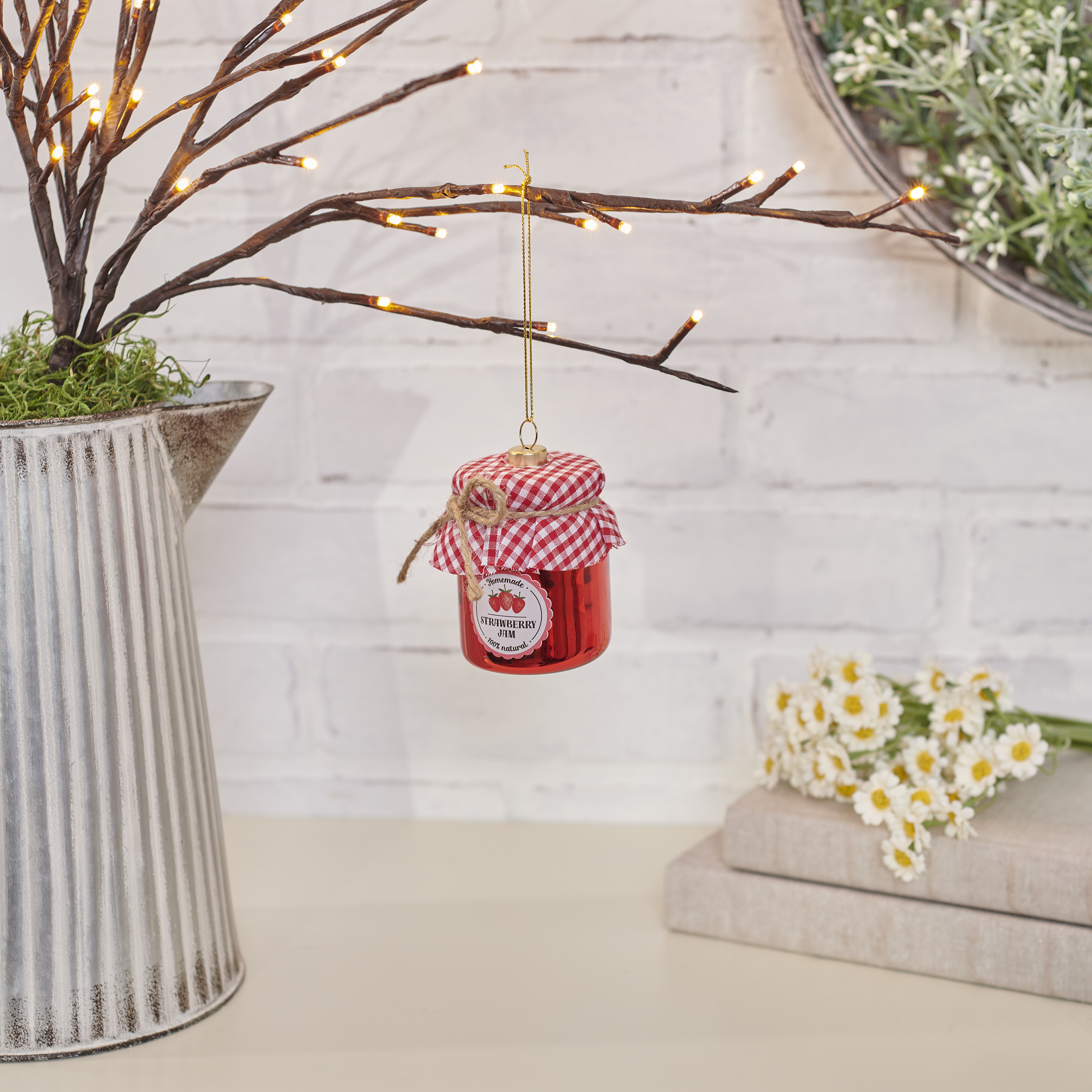 A glass ornament from our Christmas Collection displaying a design of a jar of strawberry jam with label detail and red gingham pattern paper cover tied with jute. Our glass Strawberry Jam ornament is ready to hang via the included top loop. A fun strawberry-themed home accent perfect for a Christmas tree or for gifting.