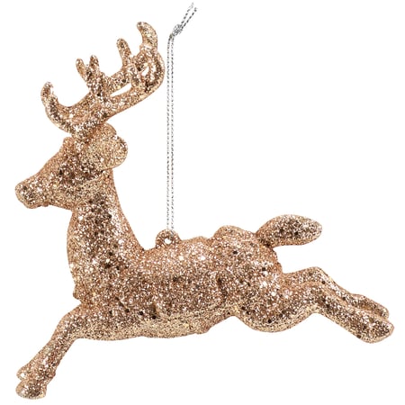 A decorative ornament from our Christmas Collection displaying a sculpted running deer design with glitter finish for added interest. Our Glitter Deer ornament is easy to hang for display via attached string hanger. A stylish Christmas home accent perfect for a Christmas tree or for seasonal decorating.