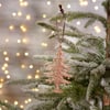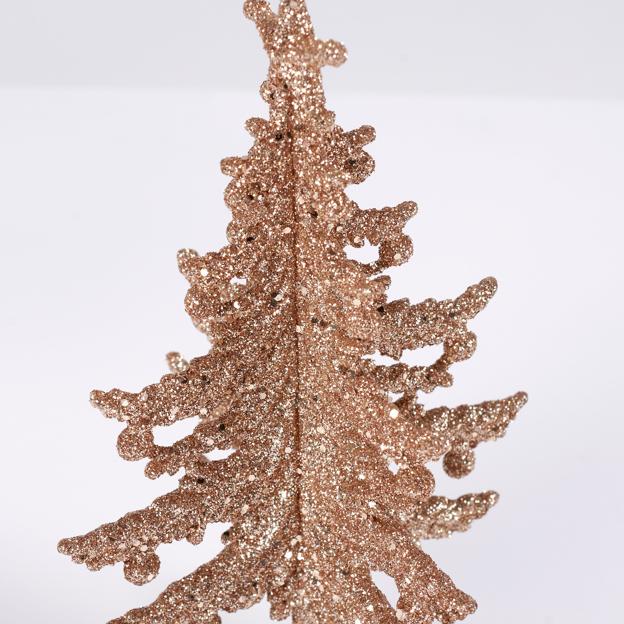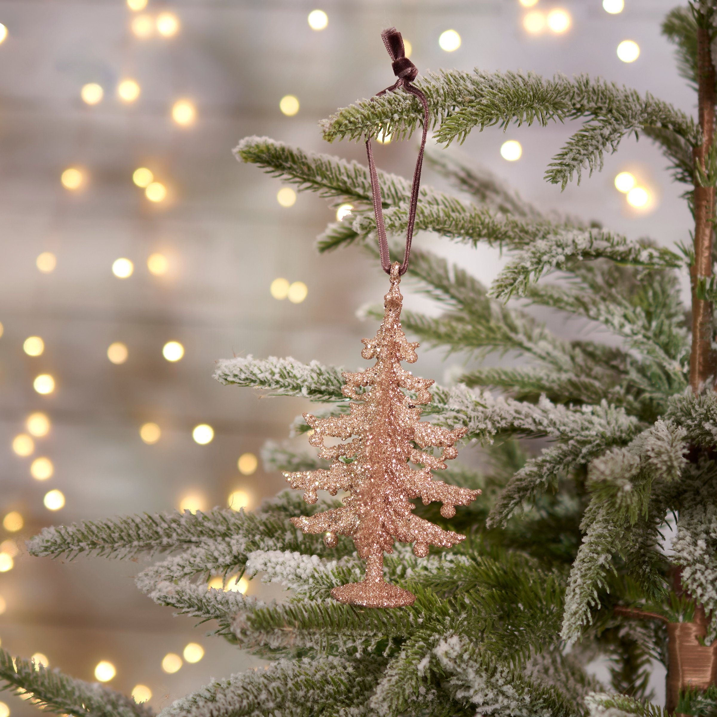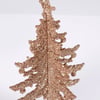 A decorative ornament from our Christmas Collection displaying sculpted Christmas tree design with a glitter finish. Our Glitter Tree ornament is easy to hang for display via attached brown velvet hanger. A vintage ornament perfect for seasonal decorating.