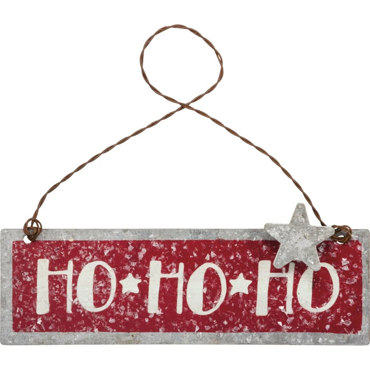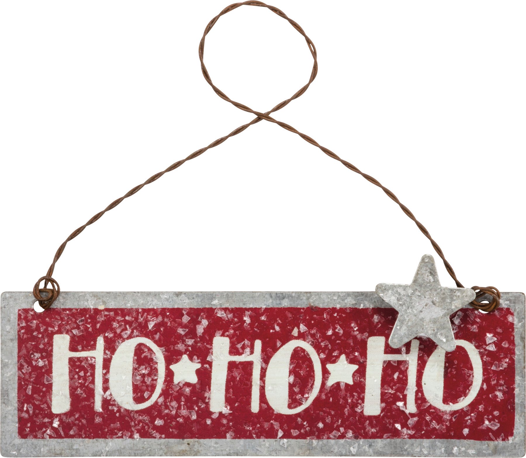 A tin ornament from our Christmas Collection featuring a "Ho Ho Ho" sentiment, star accent, and textured coating for a snowy effect. The Ho Ho Ho ornament contains a twisted top wire loop for easy hanging.