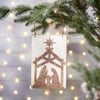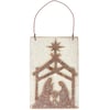 A wooden ornament from our Christmas Collection displaying an embossed nativity design with mica coating for a frosty appearance. Seasonal ornament features distressed details with coordinating natural wood on the sides and back. Our Holy Night ornament is easy to hang for display via attached twisted wire hanger. A rustic nativity-themed ornament perfect for seasonal display.