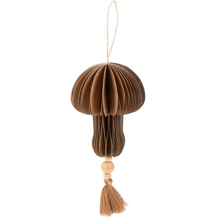 A paper honeycomb ornament from our Fall & Harvest Collection displaying a brown mushroom in a folded paper design with wood bead and jute tassel on the bottom. Our Honeycomb Mushroom ornament is designed to hang for display via attached jute hanger. To display mushroom, unfold and attach ends via magnetic closure. Seasonal paper mushroom ornament folds up flat when not in use for compact storage. A charming mushroom-themed home accent perfect for any room or for event decorations.