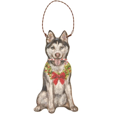 A wooden ornament from our Christmas Collection cut in the shape of the displayed holiday dog design featuring a charming husky wearing a Christmas wreath with a candy cane in its mouth. Design is replicated from original artwork painted onto burlap canvas, giving the art a unique depth and texture. Seasonal ornament features distressed details with coordinating natural wood on the sides and back where it can be personalized with owner's pet name and details. Our Husky Candy Cane ornament is easy to hang for display via attached twisted wire hanger. A fun holiday gift combining a love of Christmas and pets.