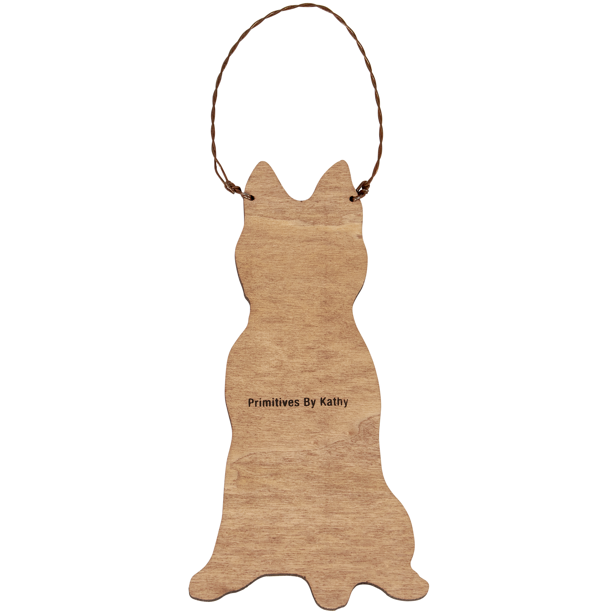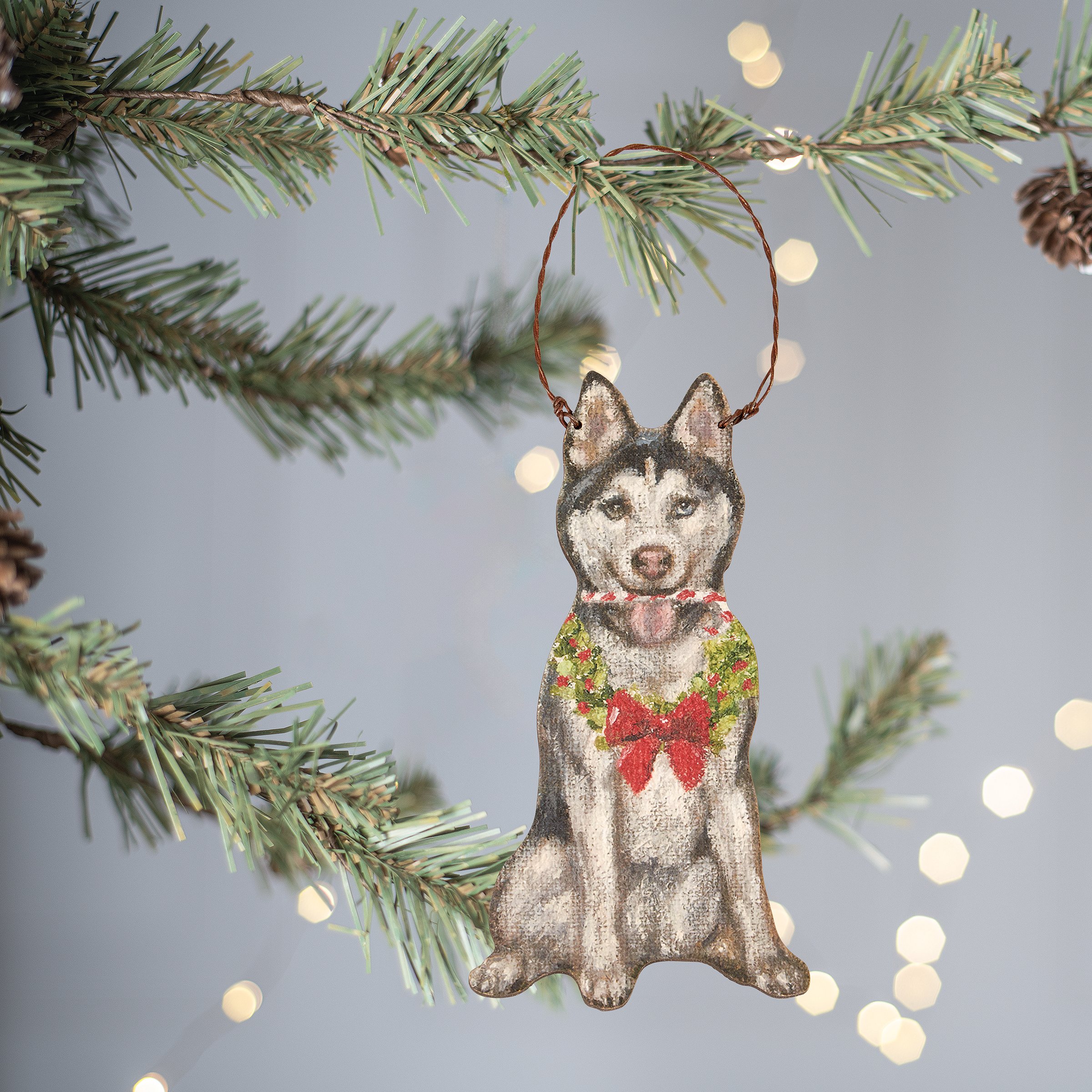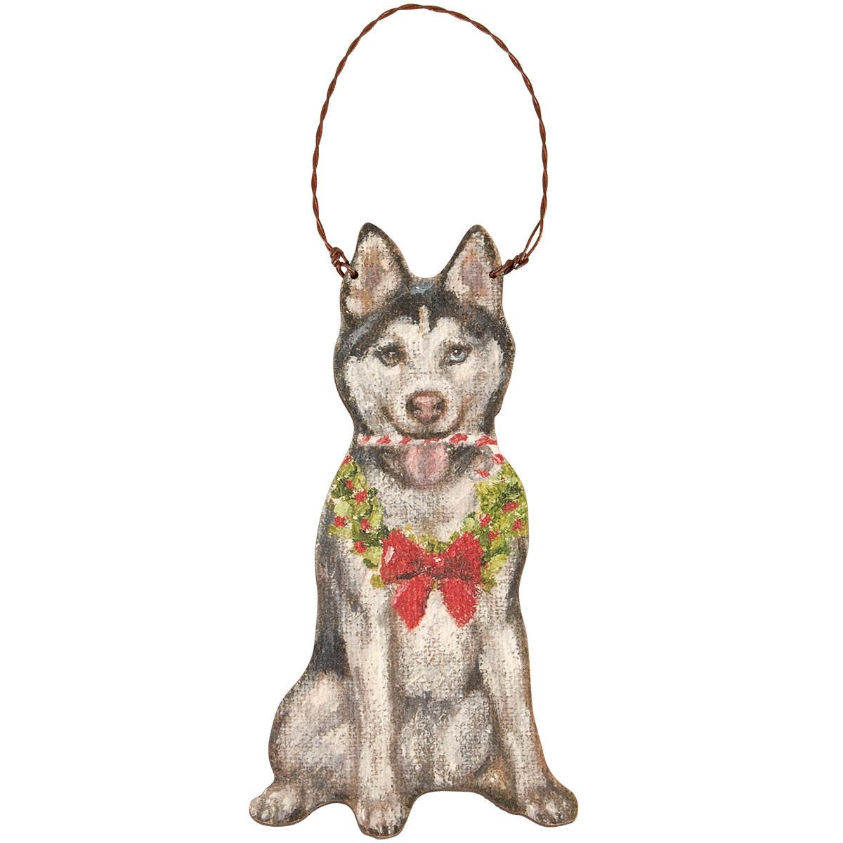 A wooden ornament from ourĀ Christmas Collection cut in the shape of the displayed holiday dog design featuring a charming husky wearing a Christmas wreath with a candy cane in its mouth. Design is replicated from original artwork painted onto burlap canvas, giving the art a unique depth and texture. Seasonal ornament features distressed details with coordinating natural wood on the sides and back where it can be personalized with owner's pet name and details. Our Husky Candy Cane ornament is easy to hang for display via attached twisted wire hanger. A fun holiday gift combining a love of Christmas and pets.