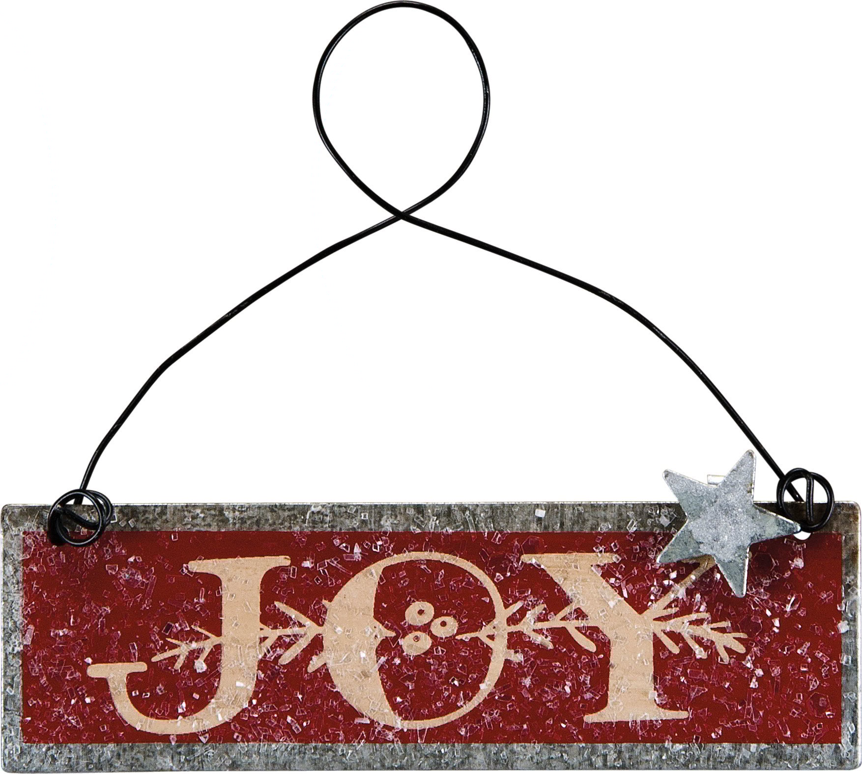A metal ornament for the holidays featuring a "Joy" sentiment, holly design, star accent, and textured coating for a snowy effect. Contains top wire loop for easy hanging.