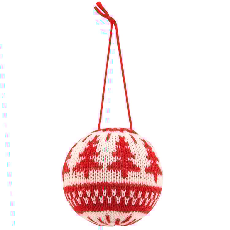 A decorative ornament from our Christmas Collection displaying a ball shape wrapped with knitted Nordic inspired tree designs. Our Knitted Nordic Ball ornament is ready to hang via attached string hanger. A vintage Christmas home accent perfect for a Christmas tree or for seasonal decorating.