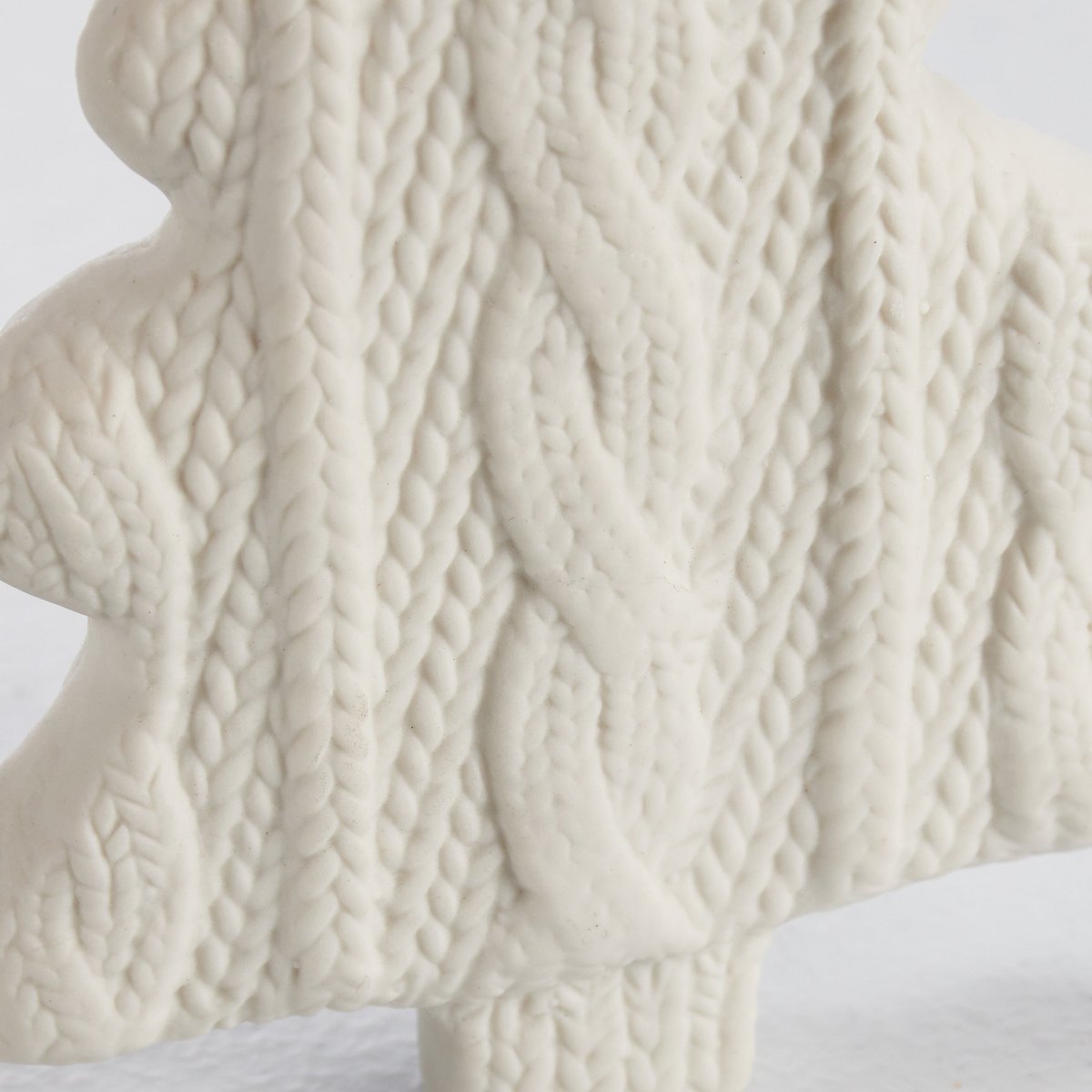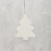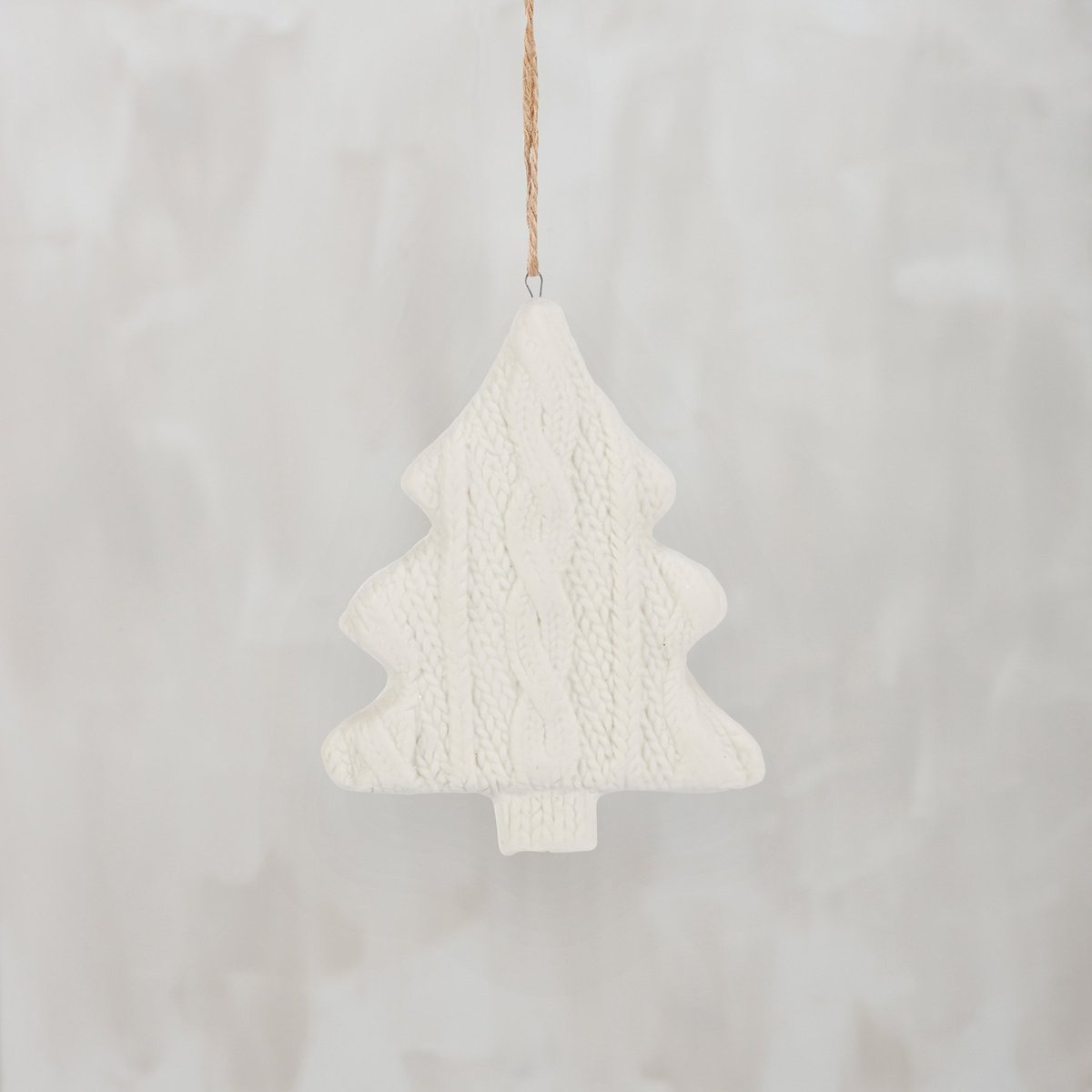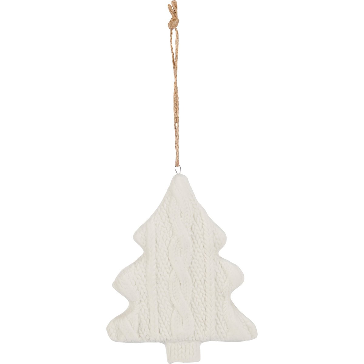 A decorative stoneware ornament from our Christmas Collection featuring a knitted mitten Christmas tree shape in a neutral color palette. Our Knitted Tree ornament is easy to hang via attached jute hanger. A neutral seasonal home accent.
