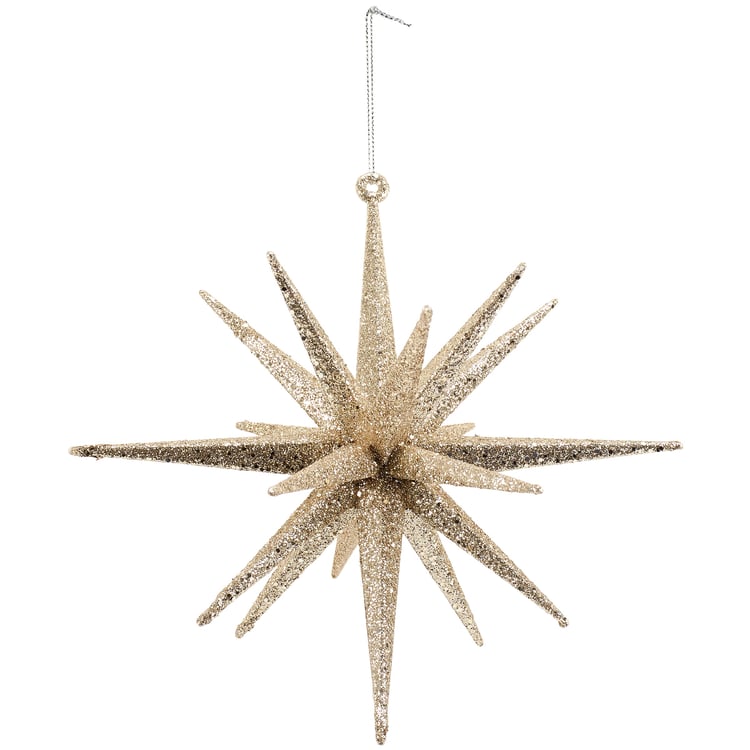 A large decorative ornament from our Christmas Collection displaying a sculpted starburst design with glitter finish for added interest. Our large Starburst ornament is easy to hang for display via attached string hanger. A stylish Christmas home accent perfect for a Christmas tree or for seasonal decorating.