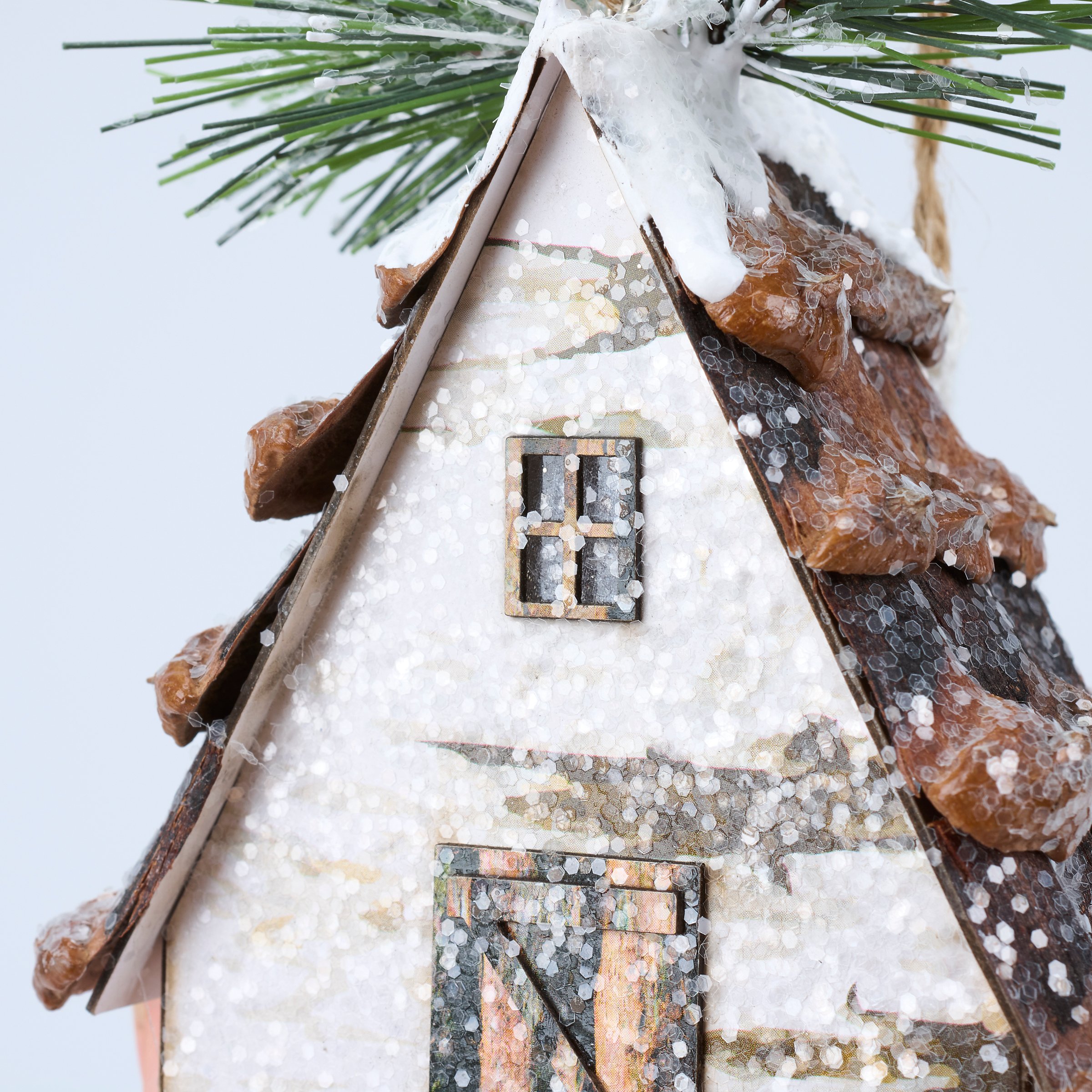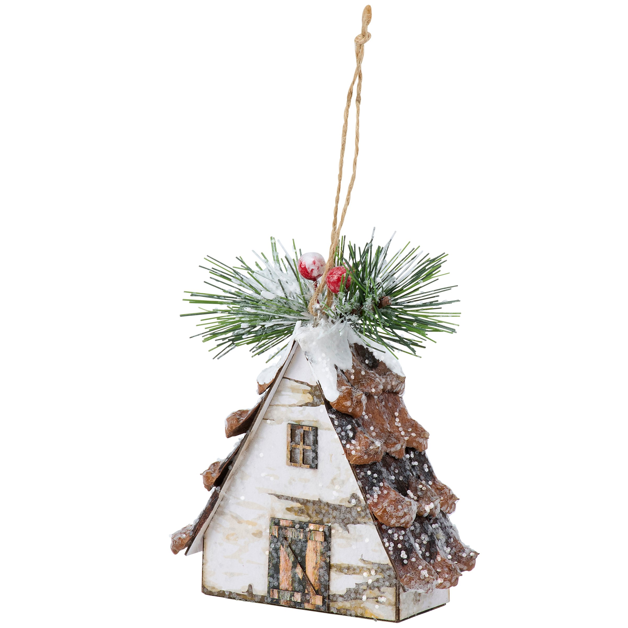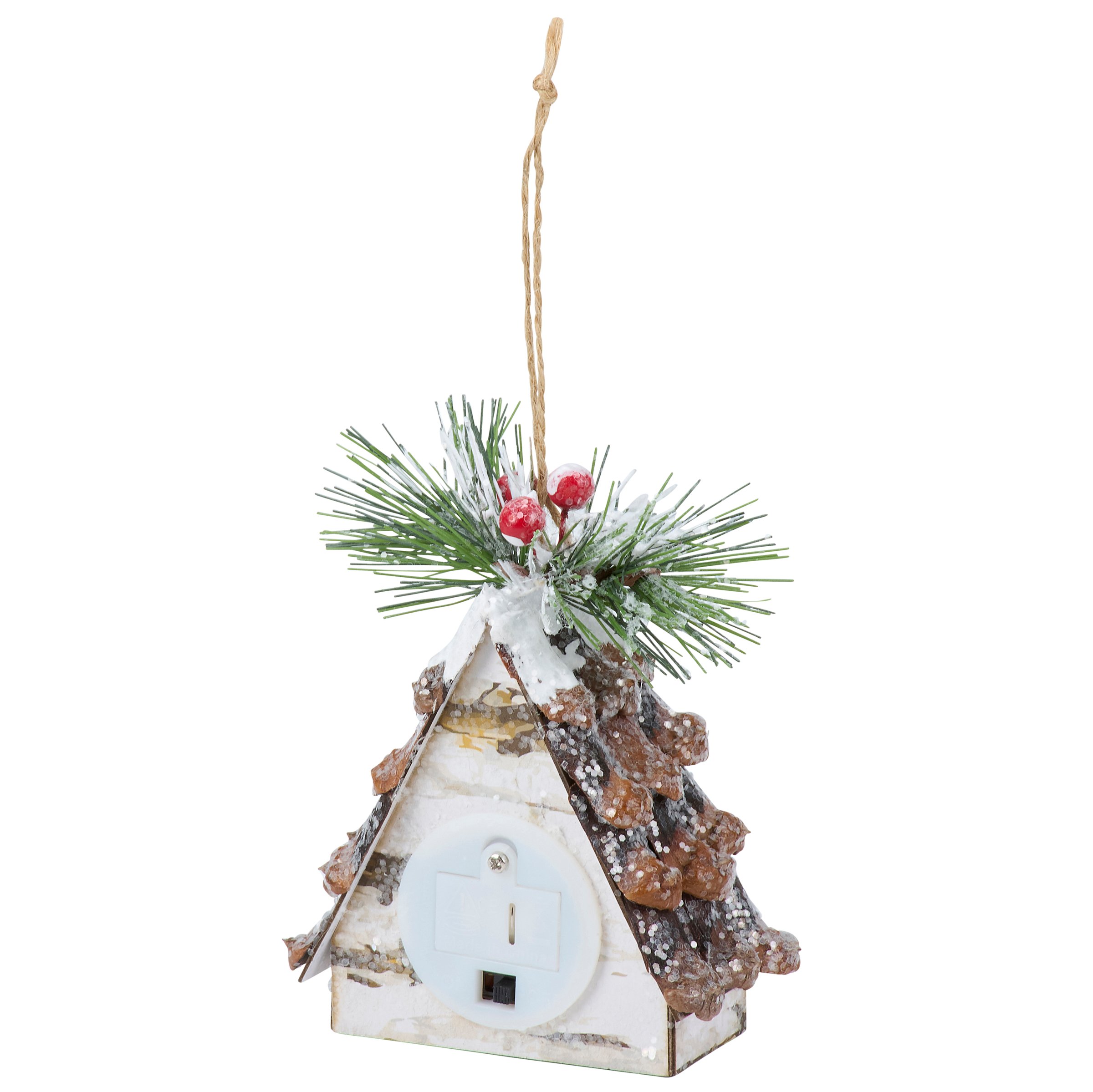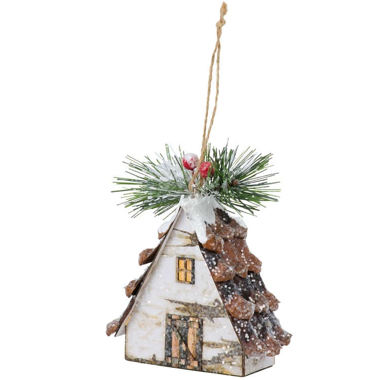 A decorative ornament from our Christmas Collection displaying a winter cabin design with pine and berries on top as well as mica detail for a snowy effect. Winter cabin ornament features a light source inside that illuminates the windows powered by 3 LR44 batteries (not included). Our Lighted Cabin ornament is ready to hang via the attached jute string hanger. A winter themed home accent perfect for adding seasonal lighting to any Christmas tree.