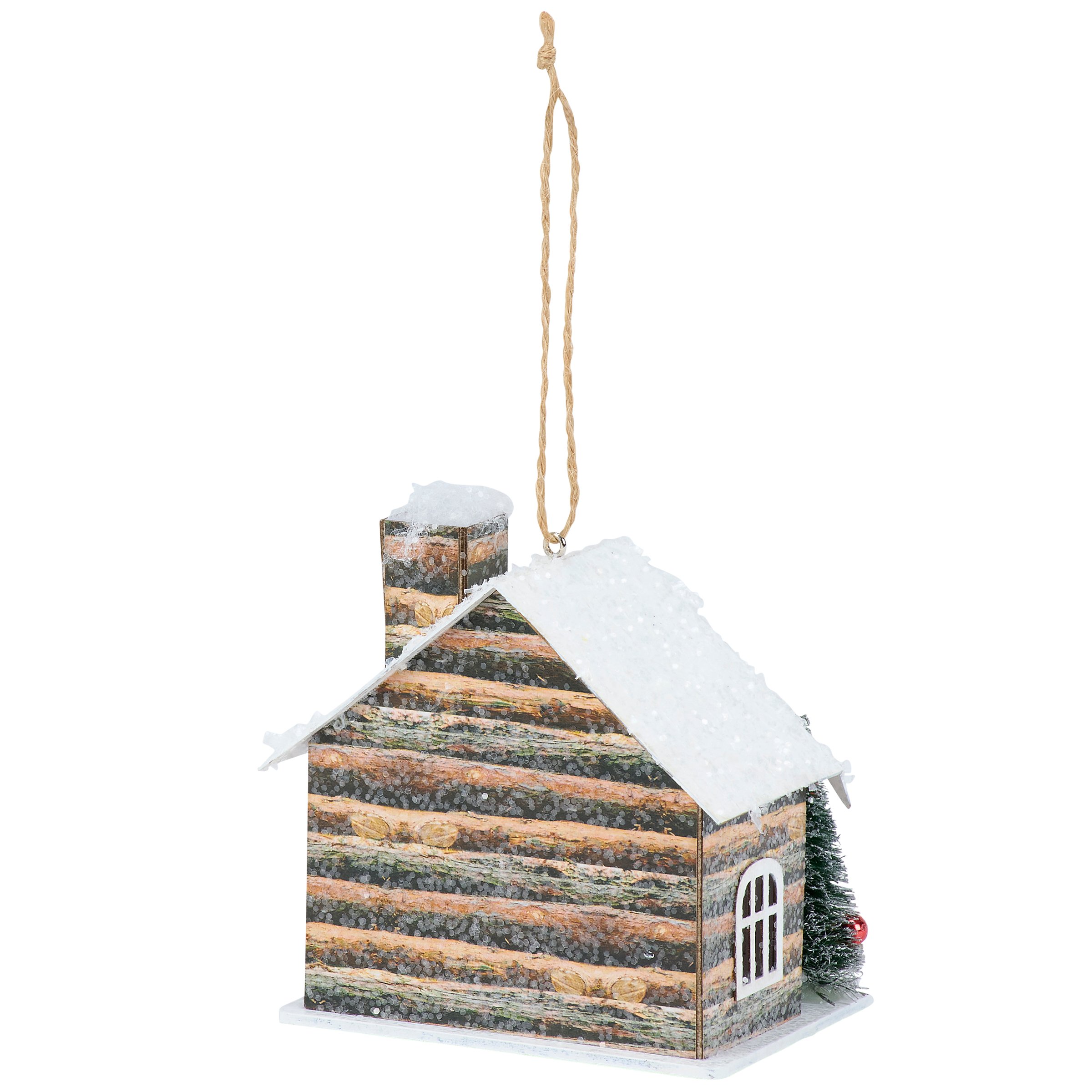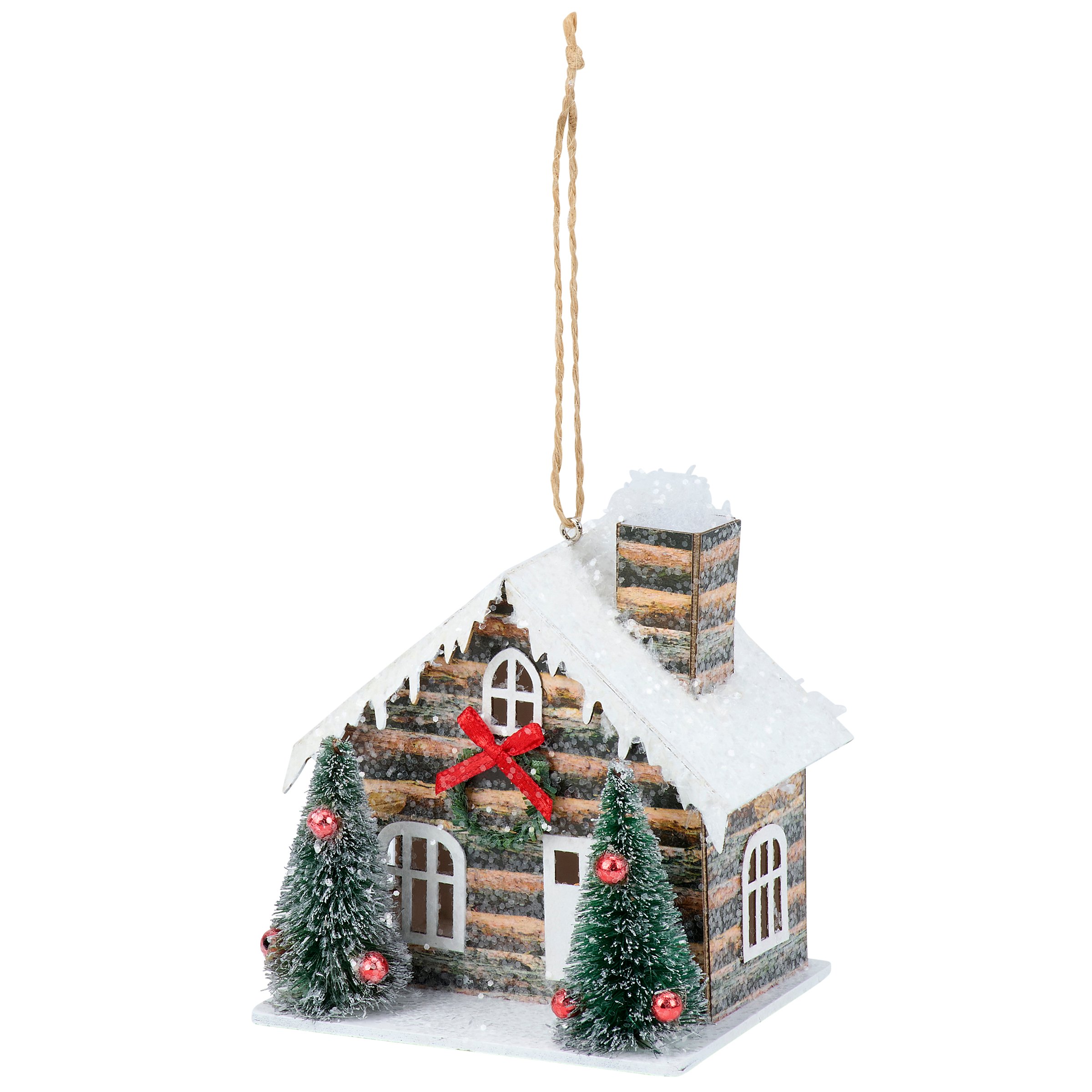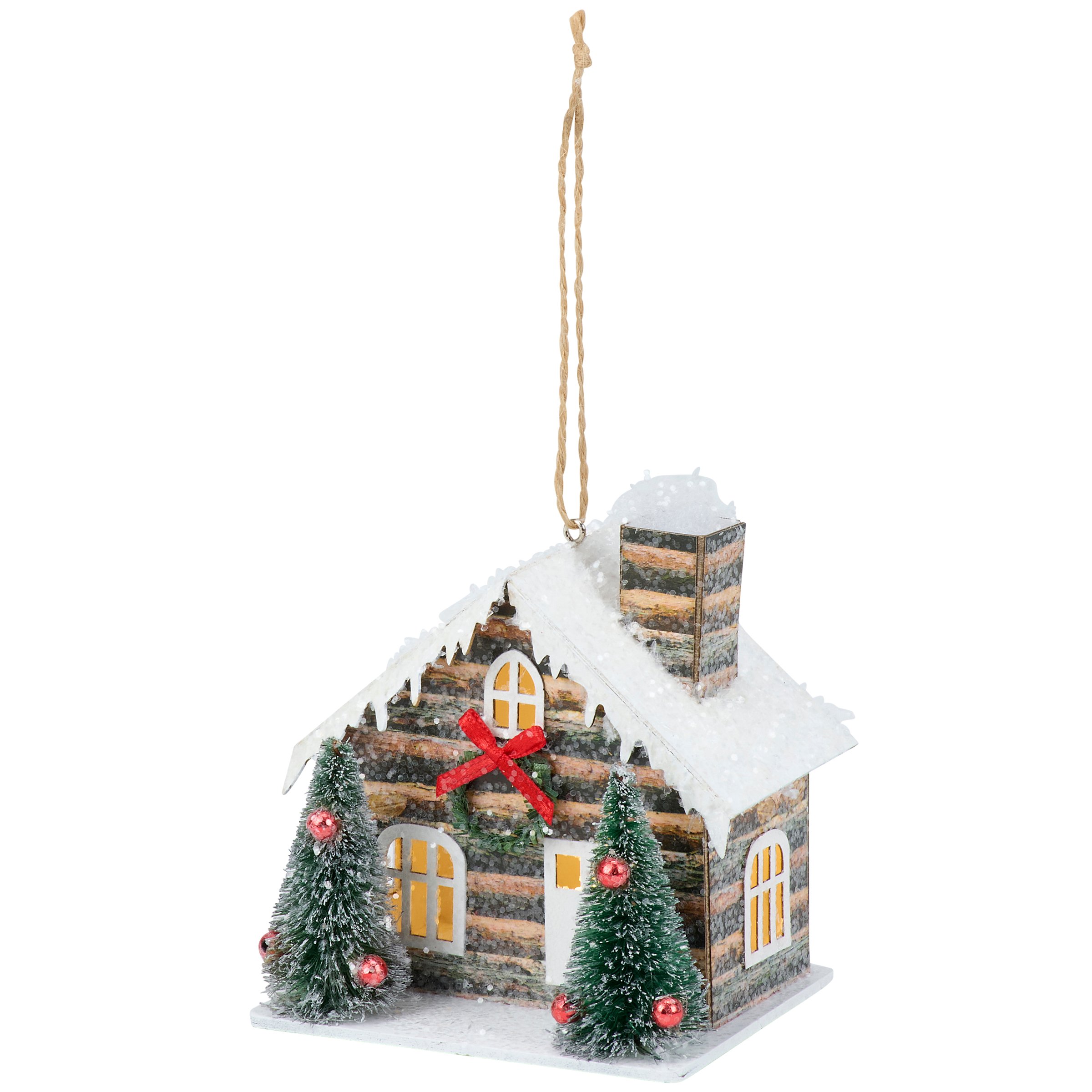 A decorative ornament from our Christmas Collection displaying a winter log cabin design with bottle brush trees and glitter detail for a frosty finish. Winter log cabin ornament features a light source inside that illuminates the windows powered by 3 LR44 batteries (not included). Our Lighted Log Cabin ornament is ready to hang via the attached jute string hanger. A winter themed home accent perfect for adding seasonal lighting to any Christmas tree.