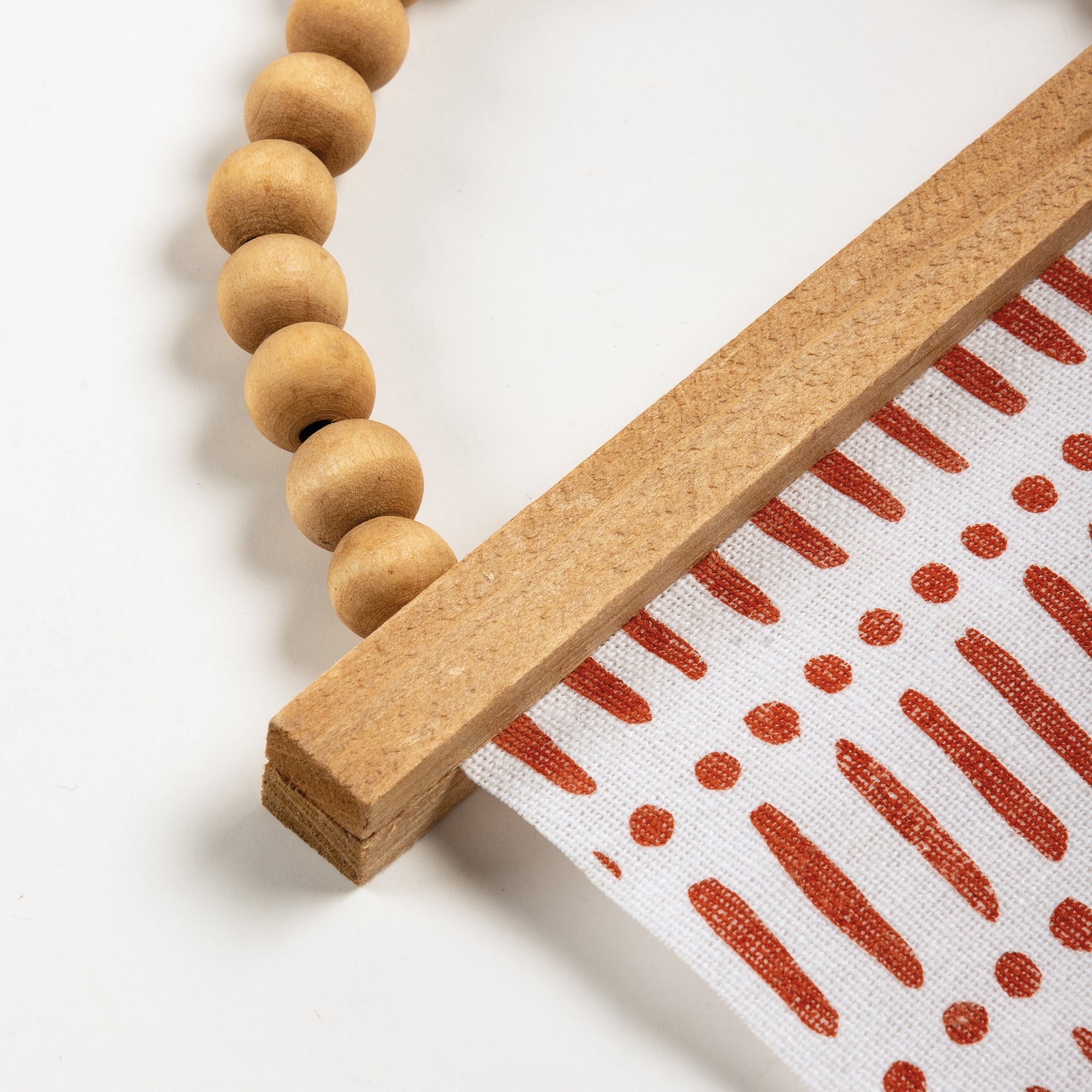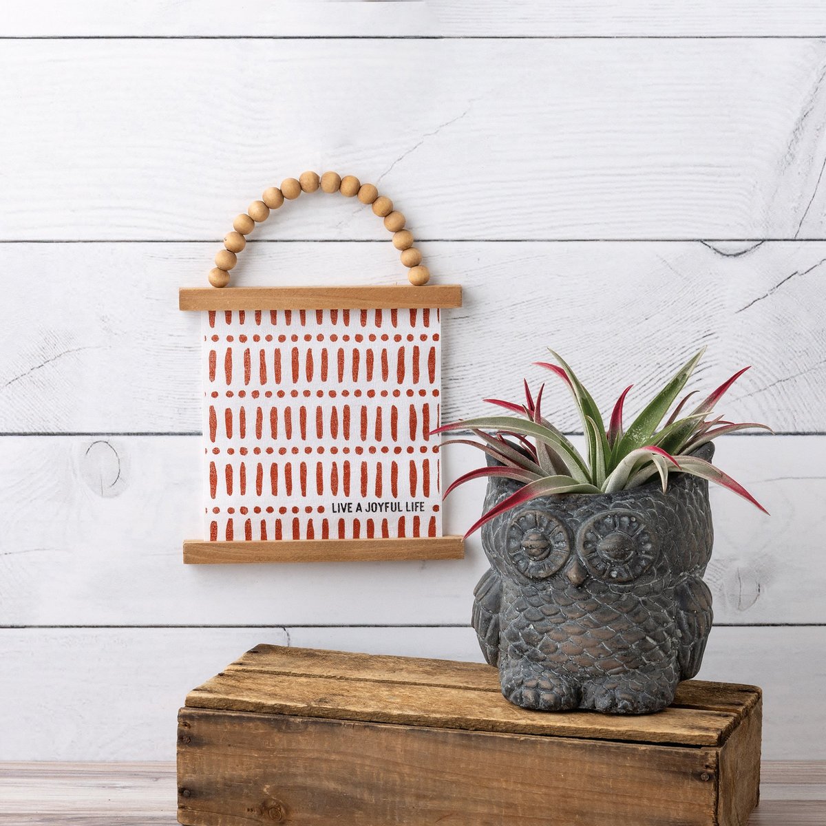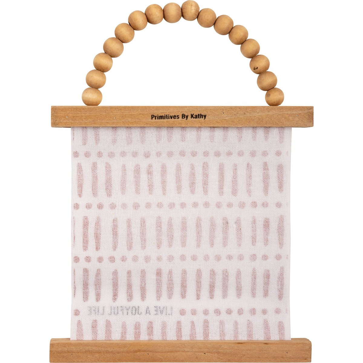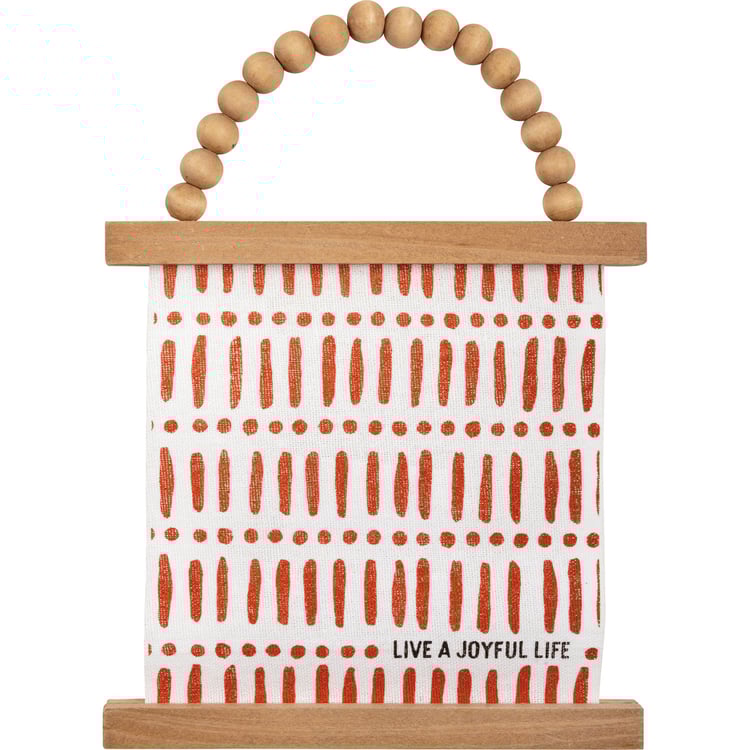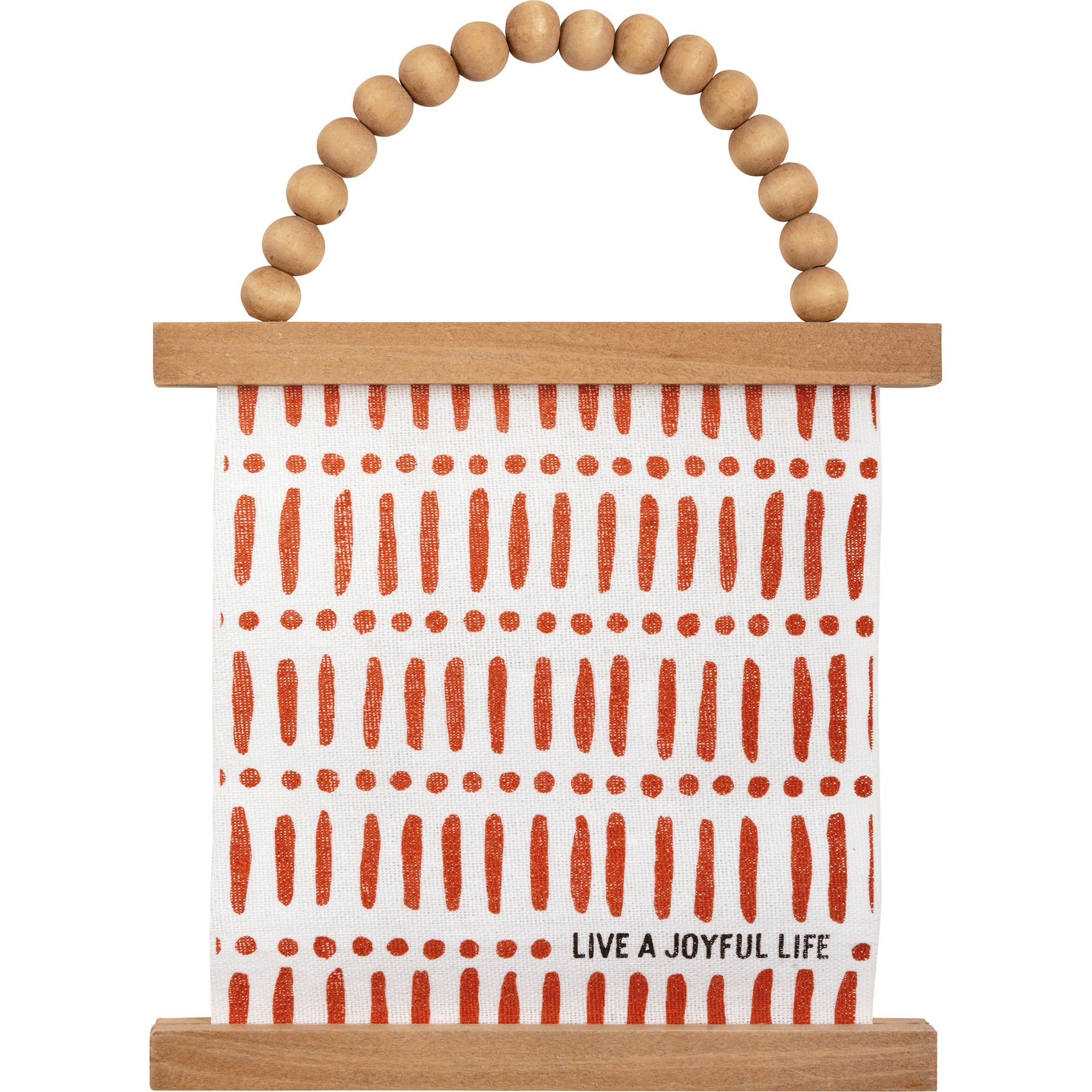 A hanging décor piece featuring bohemian style designs with "Live A Joyful Life" sentiment stretched between two wooden slats. Our Joyful Life wall décor easily hangs via wooden beaded hanger.