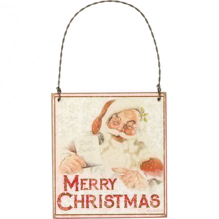 A timeless holiday staple piece, this wooden ornament features a vintage-inspired Santa Claus design, "Merry Christmas" sentiment, and muted holly background. Complements well with coordinating styles for a cohesive Christmas collection. Contains a twisted top wire loop for easy hanging.