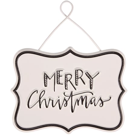 A metal ornament from our Christmas Collection displaying a black and white design of a "Merry Christmas" sentiment with embossed details. Our Merry Christmas ornament is ready to hang via attached wire hanger. A rustic Christmas home accent perfect for a Christmas tree or for seasonal decorating.