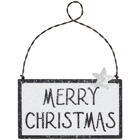 A galvanized metal ornament from our Christmas Collection displaying a seasonal sentiment in a hand illustrated style that reads "Merry Christmas." Seasonal ornament features galvanized metal star cutout and mica coating for an icy finish. Our Merry Christmas ornament is ready to hang via attached twisted wire hanger. A rustic Christmas home accent perfect for a Christmas tree or for seasonal decorating.