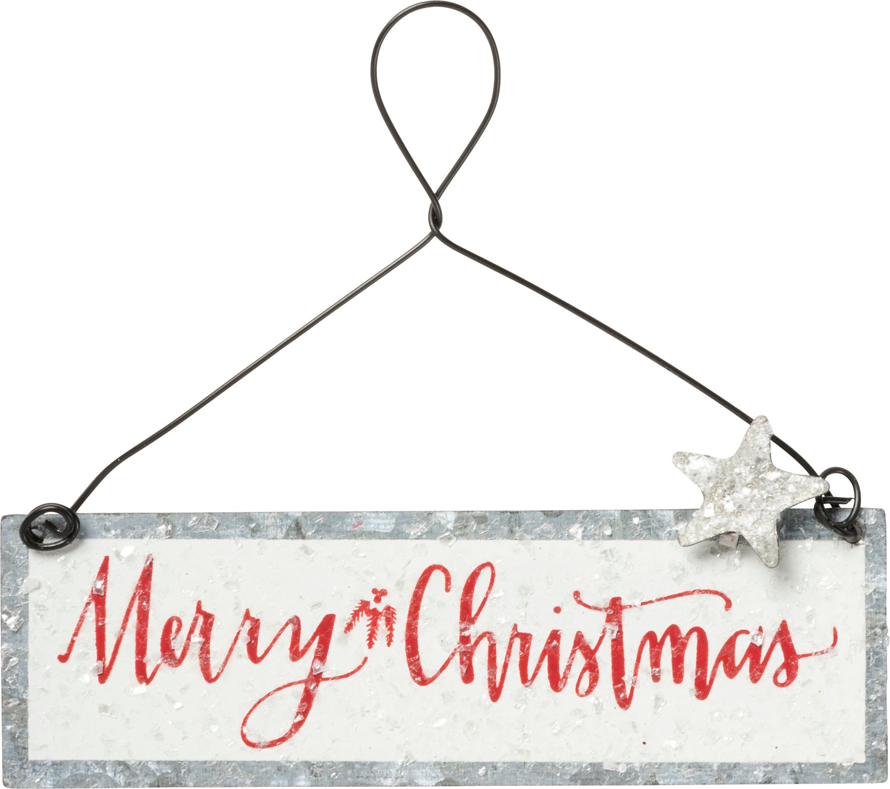 A metal ornament with a hand lettered "Merry Christmas" sentiment, star accent, textured coating for snowy effect. Contains top wire loop for easy hanging.