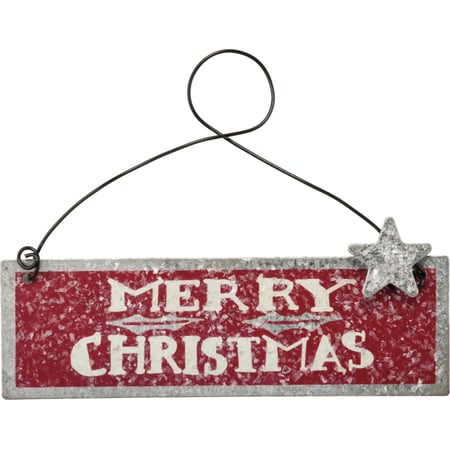 A tin ornament for Christmas featuring a hand lettered "Merry Christmas" sentiment, textured coating for snowy effect, and dimensional star accent. Contains a twisted top wire loop for easy hanging.