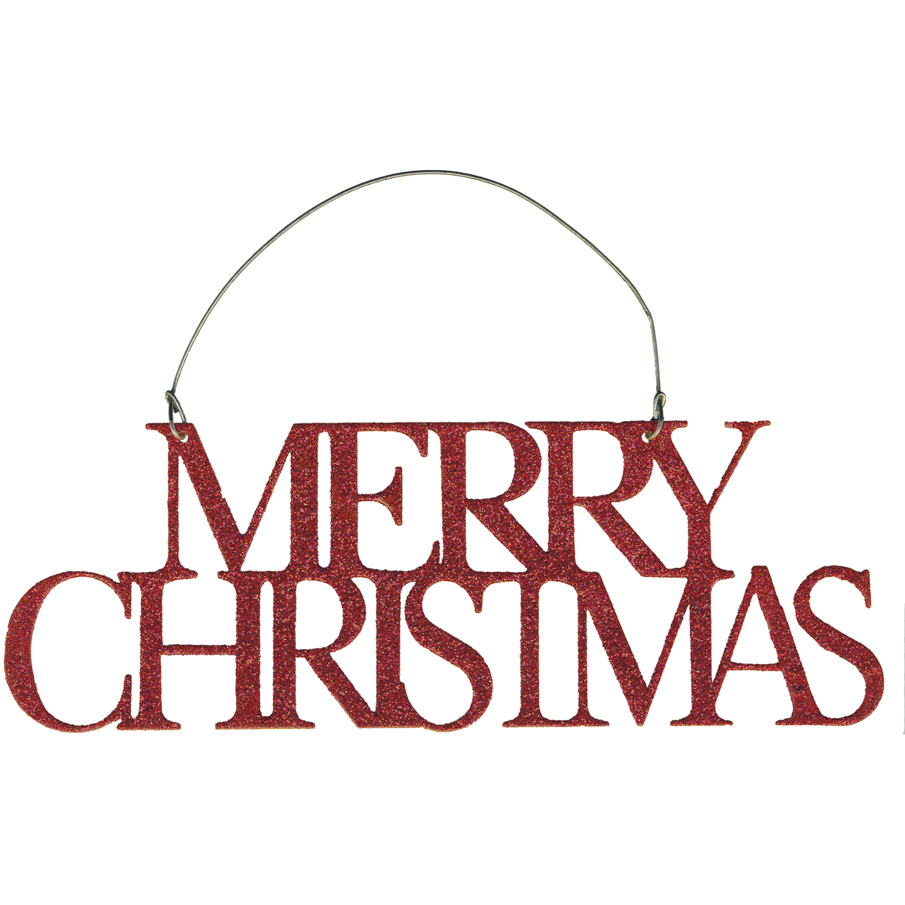 A deep red glitter-embellished ornament lending "Merry Christmas" sentiment. Complements well with other pieces in collection or existing decor.