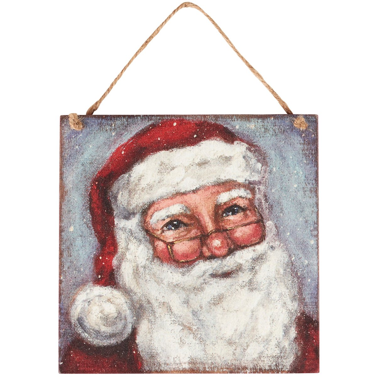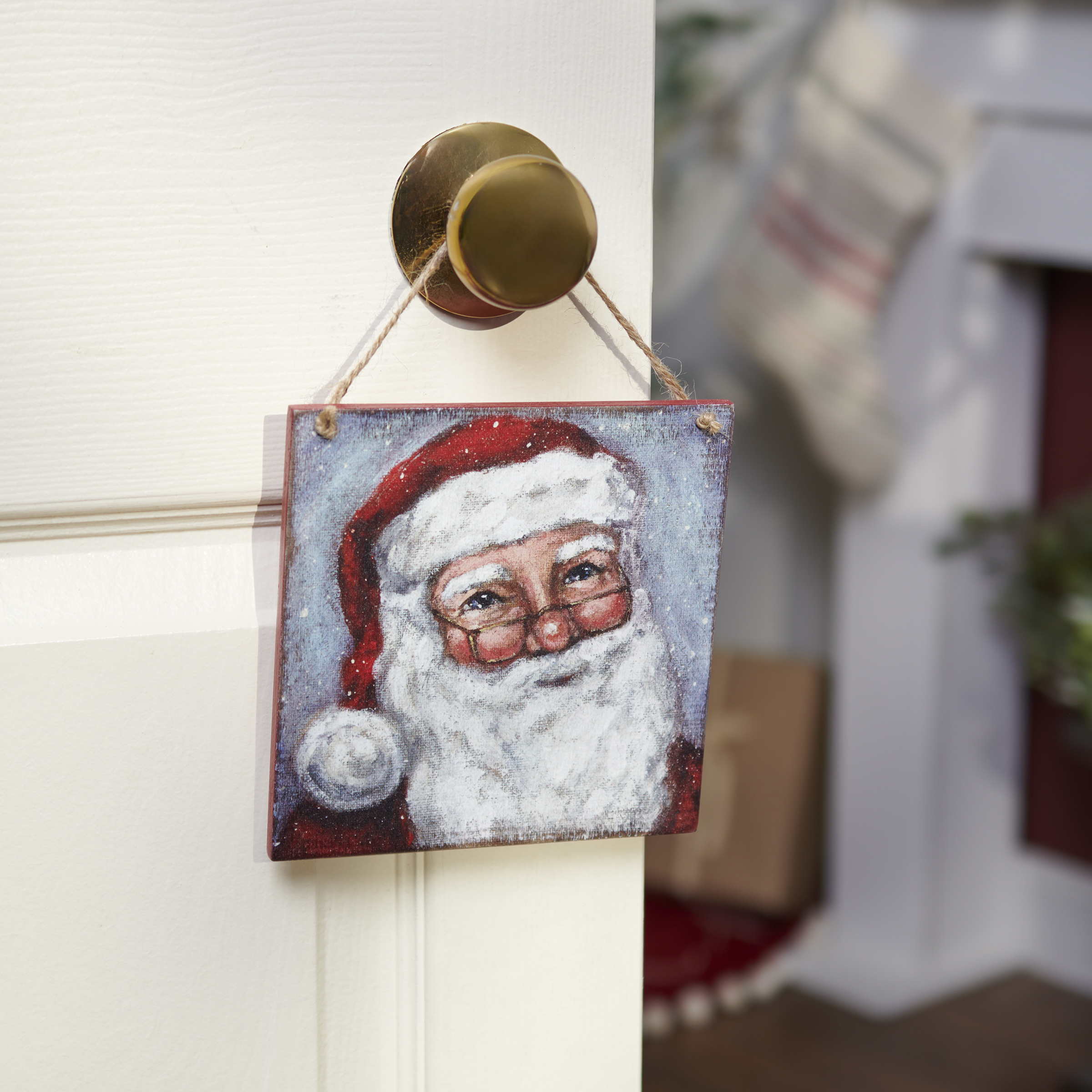 A wooden ornament from our Christmas Collection displaying a charming winter scene of a merry Santa. Design is replicated from original artwork painted onto burlap canvas, giving the art a unique depth and texture. Seasonal ornament features distressed details with coordinating red color on the sides and back. Our Merry Santa ornament is easy to hang for display via attached jute hanger. A rustic winter-themed ornament perfect for seasonal display.