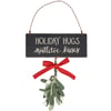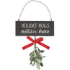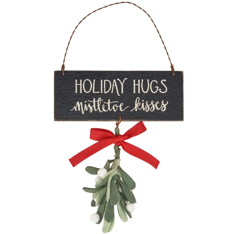 A hanging ornament from our Christmas Collection featuring a double-sided black wood sign displaying a fun holiday sentiment that reads "Holiday Hugs Mistletoe Kisses" on both sides. Seasonal ornament also includes a mistletoe made with felt and red cotton tape ribbon hanging from wood sign. Our Mistletoe Kisses ornament is easy to hang for display via the attached twisted wire loop. A fun seasonal home accent that can be easily displayed in any home for the holidays.