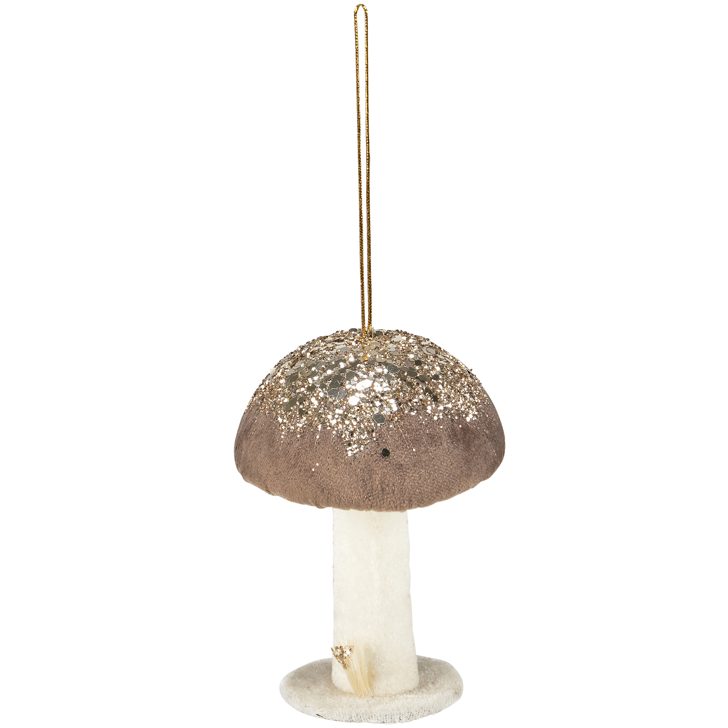 A decorative ornament from our Fall & Harvest Collection displaying a mushroom design with unique details. Mushroom design features velvet and glitter accents. Our Mushroom ornament is easy to hang for display via the attached string hanger. A nature-themed ornament perfect for seasonal display.