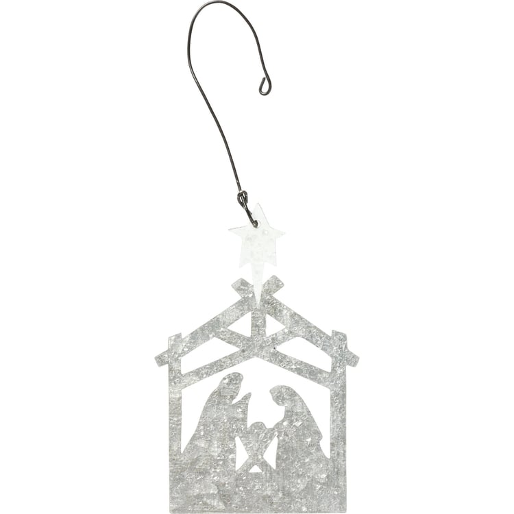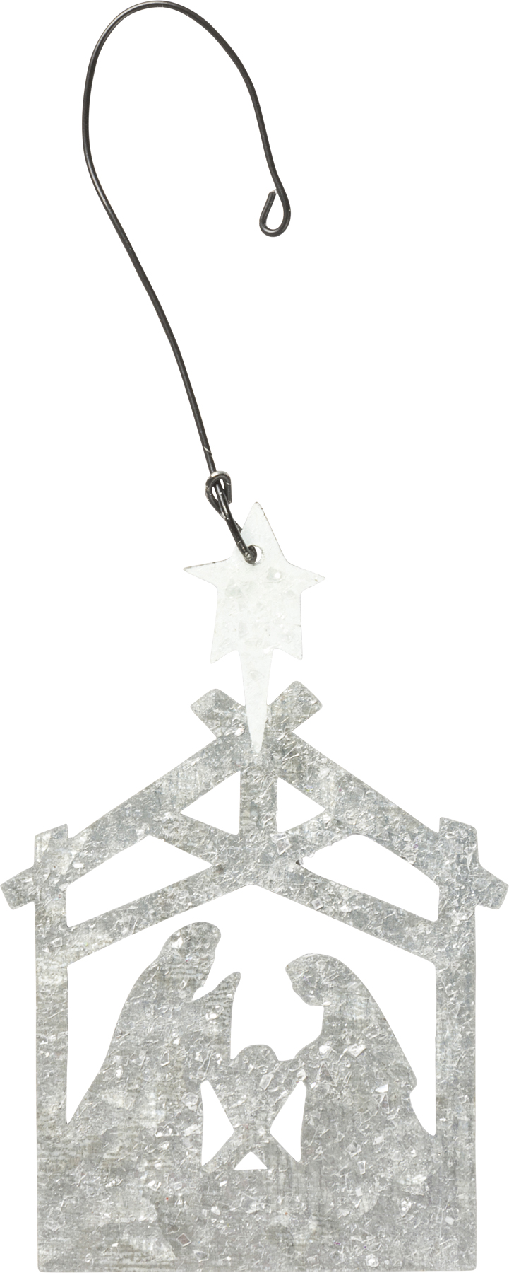 A metal nativity scene ornament from our Christmas Collection featuring a textured coating for snowy effect. This nativity metal ornament contains a top wire hook for hanging.