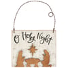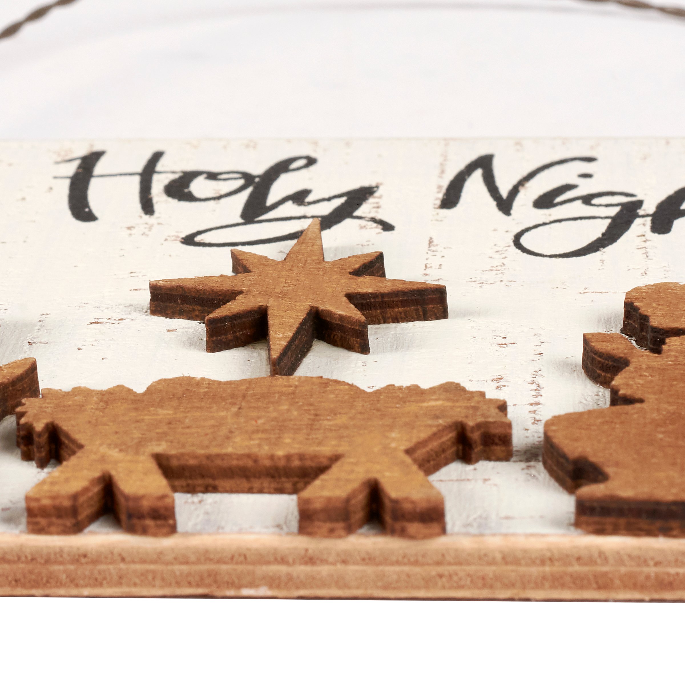 A wooden ornament from our Christmas Collection displaying a nativity scene made with wooden cutouts for added dimension as well as a seasonal sentiment that reads "O Holy Night." Seasonal ornament features distressed details with coordinating natural wood on the sides and back. Our O Holy Night ornament is easy to hang for display via attached jute hanger. A rustic nativity-themed Christmas home accent perfect for seasonal display.