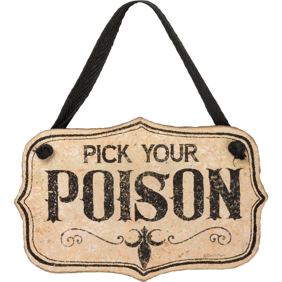 Get in the holiday spirit with this wooden sign that's perfect for on a bar cart, featuring a distressed "Pick Your Poison" sentiment with top fabric loop. Complements well with coordinating styles for a cohesive collection.