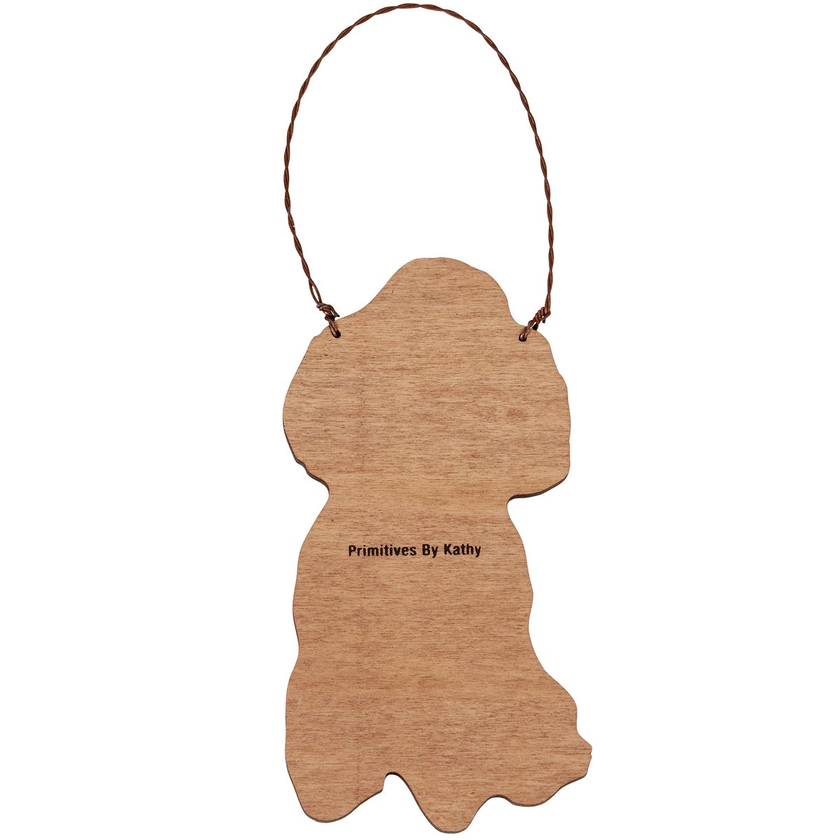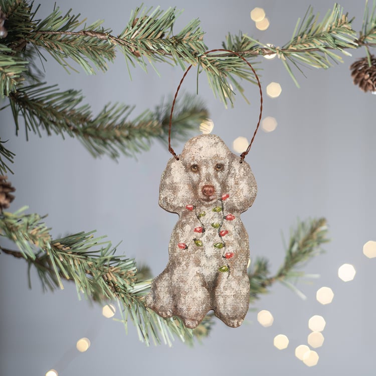 A wooden ornament from ourĀ Christmas Collection cut in the shape of the displayed holiday dog design featuring a charming poodle with Christmas lights in its mouth. Design is replicated from original artwork painted onto burlap canvas, giving the art a unique depth and texture. Seasonal ornament features distressed details with coordinating natural wood on the sides and back where it can be personalized with owner's pet name and details. Our Poodle Lights ornament is easy to hang for display via attached twisted wire hanger. A fun holiday gift combining a love of Christmas and pets.