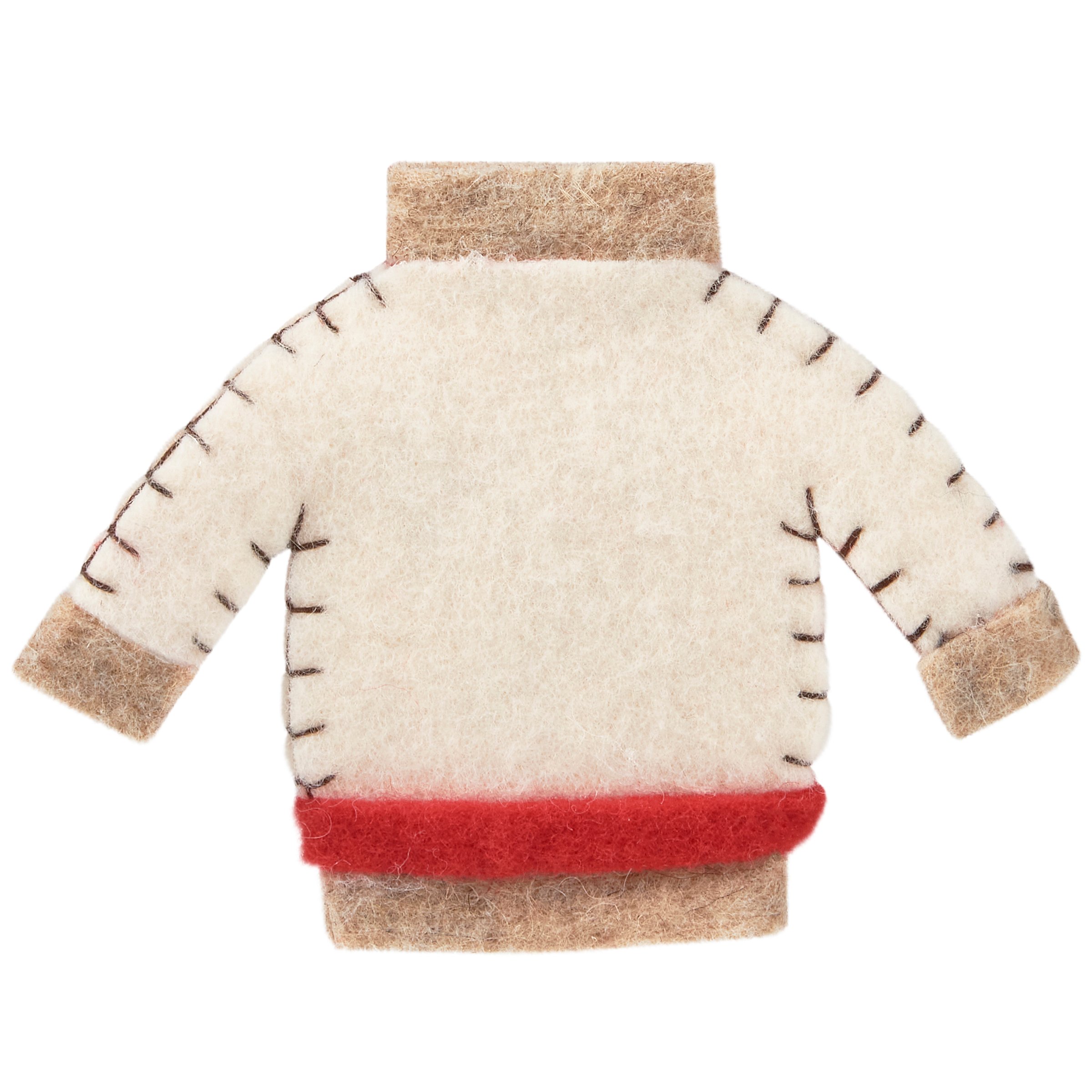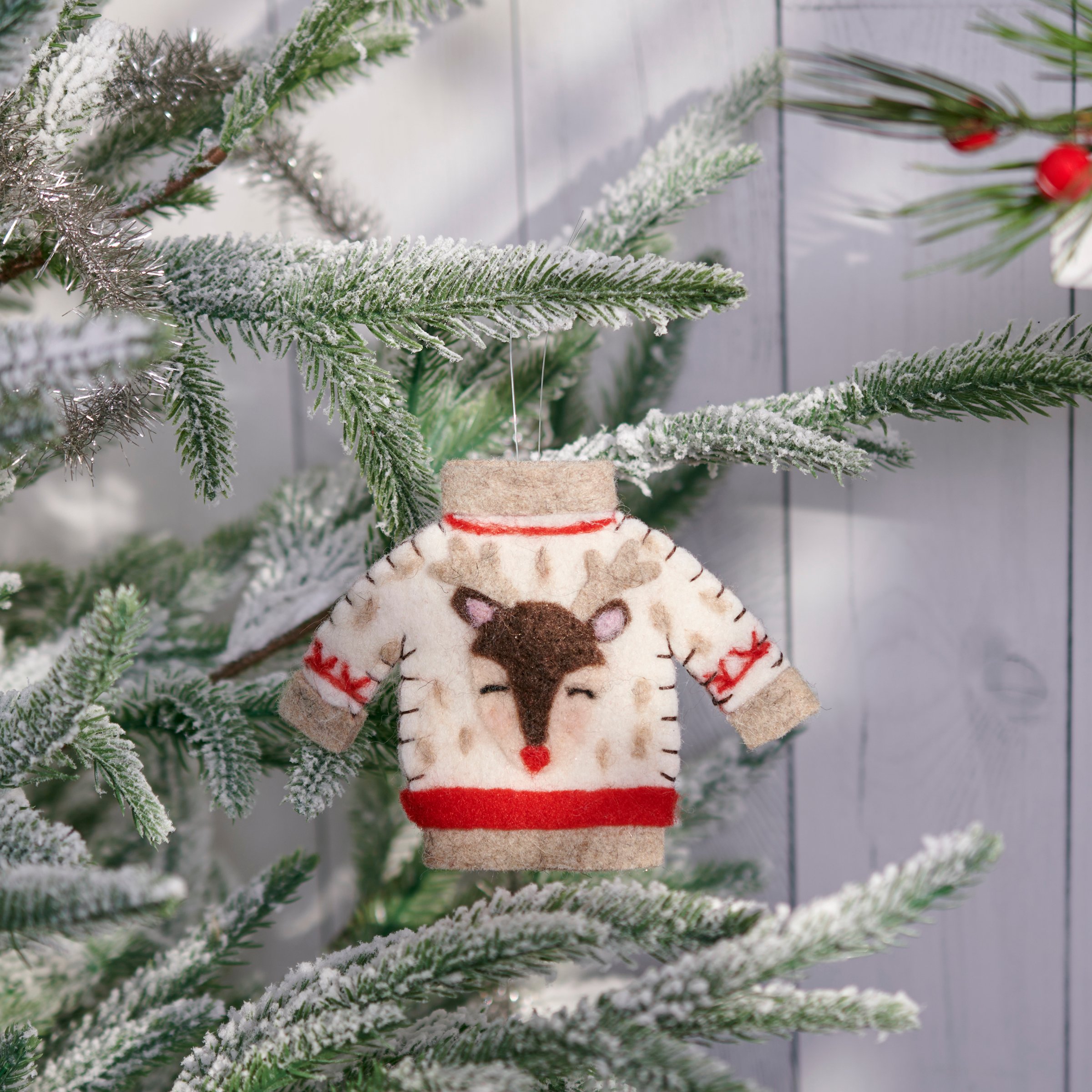 A decorative felt ornament from our Christmas Collection displaying a fun Christmas sweater design with handmade details. Sweater design features Rudolph with stitch accents. Our Rudolph Sweater ornament is easy to hang for display via the attached hanger. A fun Christmas-themed ornament perfect for seasonal display.