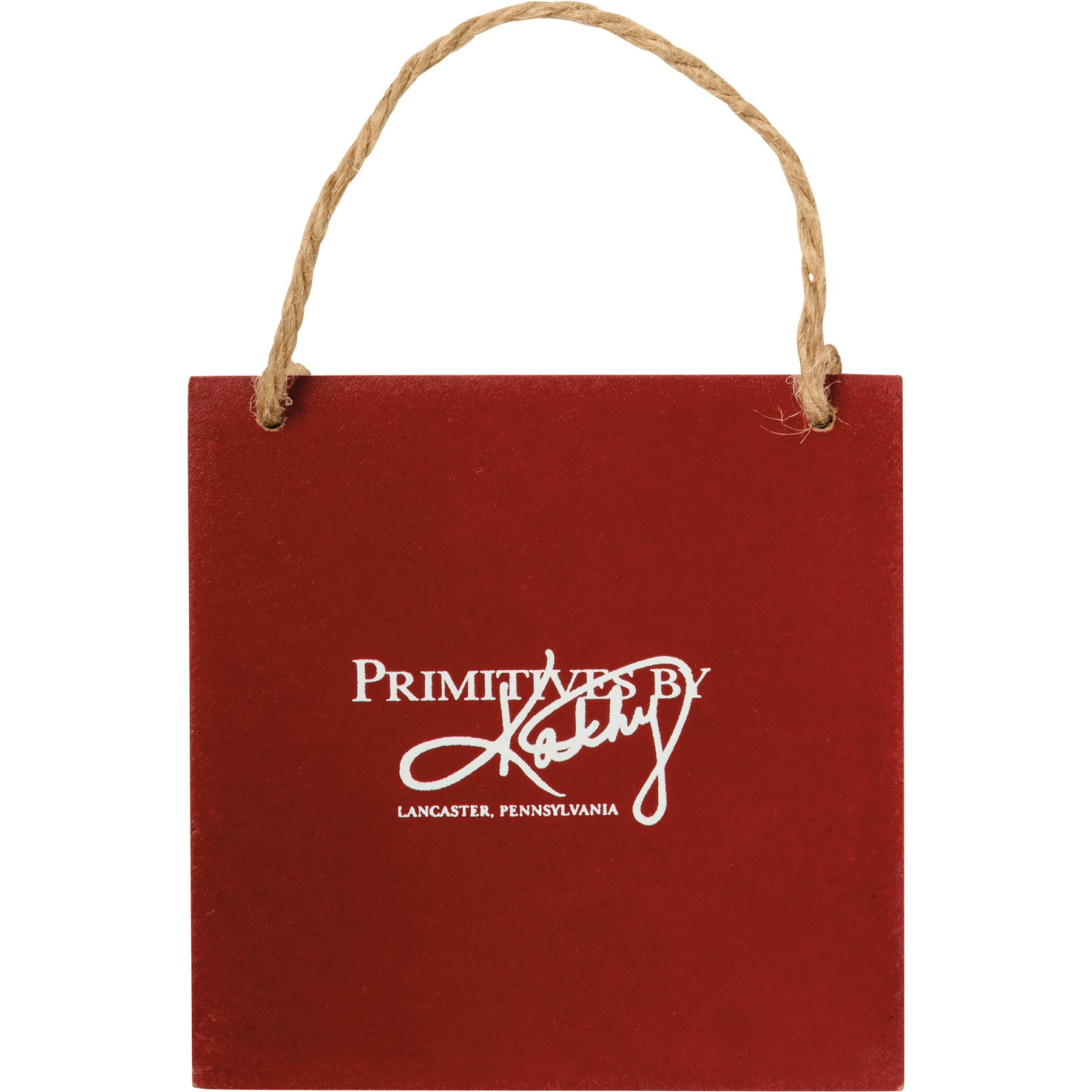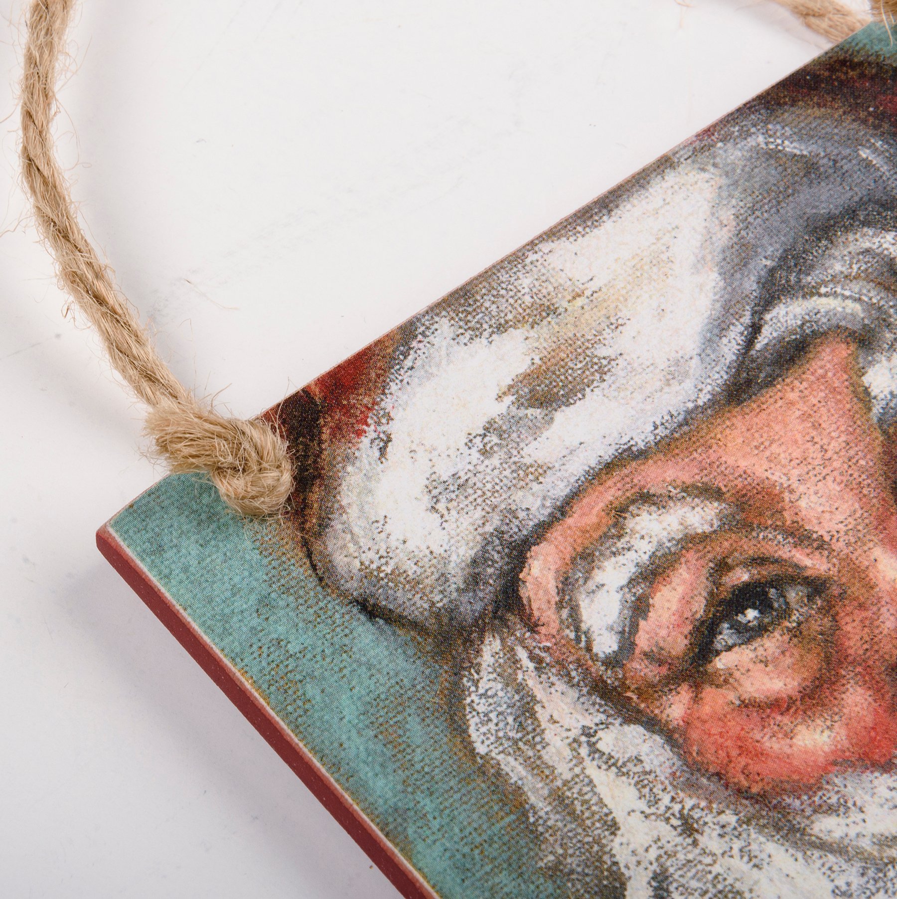 A wooden Santa ornament featuring designs replicated from original artwork painted onto burlap canvas, giving the art a unique depth and texture. Hangs via attached jute ribbon.
