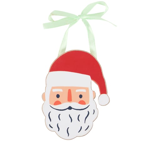 A wooden ornament from our Christmas Collection displaying a Santa head cutout shape with colorful retro inspired design. Seasonal ornament features coordinating pastel pink color on the sides and back. Our Santa ornament is easy to hang for display via attached pastel green ribbon hanger. A fun pastel inspired Christmas home accent perfect for seasonal display.