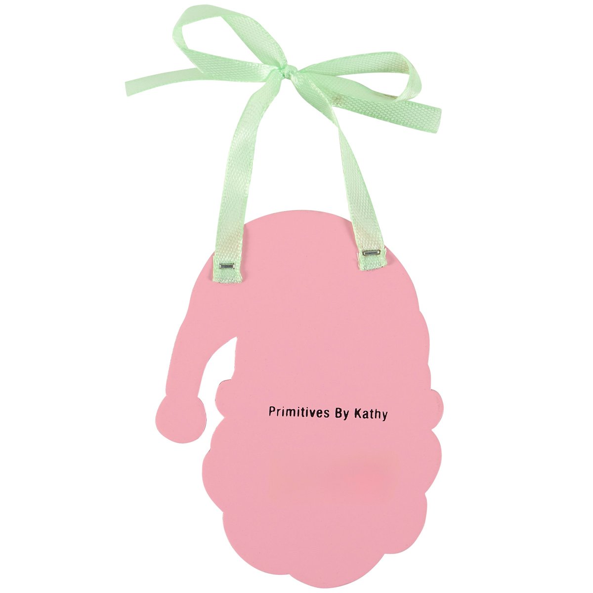 A wooden ornament from our Christmas Collection displaying a Santa head cutout shape with colorful retro inspired design. Seasonal ornament features coordinating pastel pink color on the sides and back. Our Santa ornament is easy to hang for display via attached pastel green ribbon hanger. A fun pastel inspired Christmas home accent perfect for seasonal display.