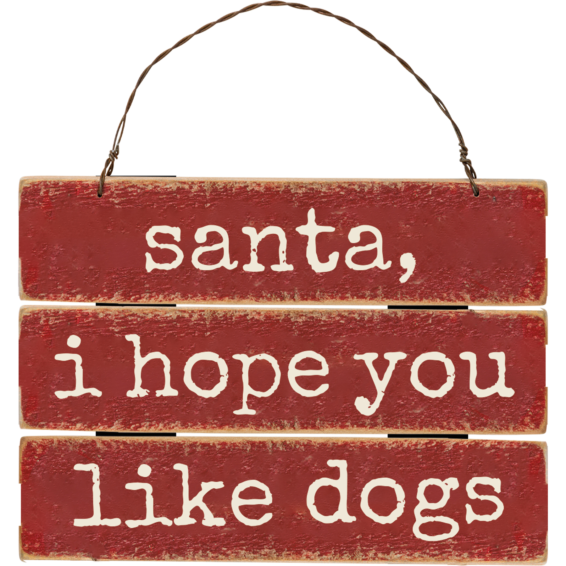 A wooden ornament featuring a pet inspired holiday design in a rustic style. Design displays a fun dog-themed seasonal sentiment on painted slat wood pieces that reads "Santa, I Hope You Like Dogs." Seasonal ornament also features distressed details on each slat wood piece. Our Santa Like Dogs slat wood ornament is easy to hang for display via attached twisted wire hanger. A fun pet-themed ornament perfect for seasonal display.