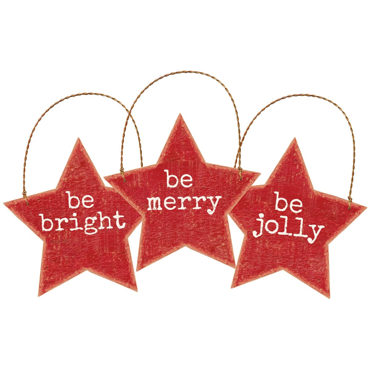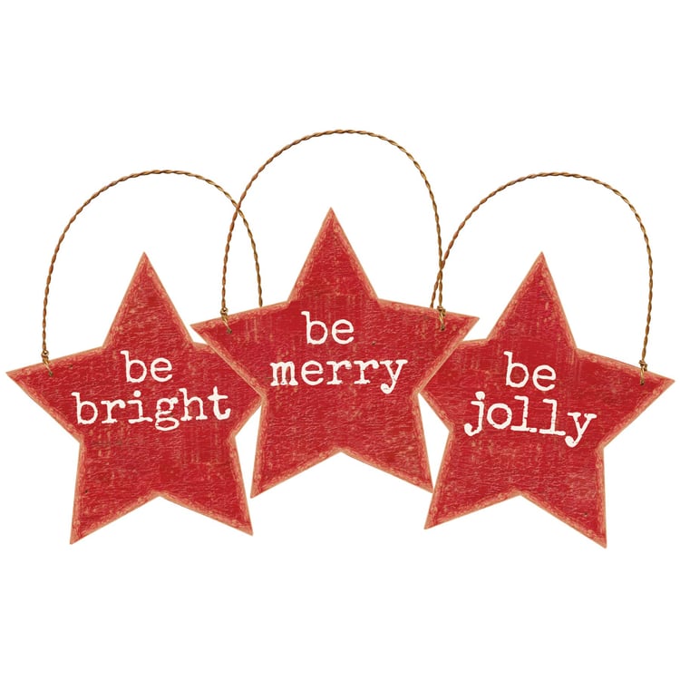 A set of three star-shaped ornaments with varying distressed "Be Bright," "Be Merry," "Be Jolly" sentiments. Contain twisted top wire loops for easy hanging and decorating. Complements well with coordinating design pieces or existing decor.