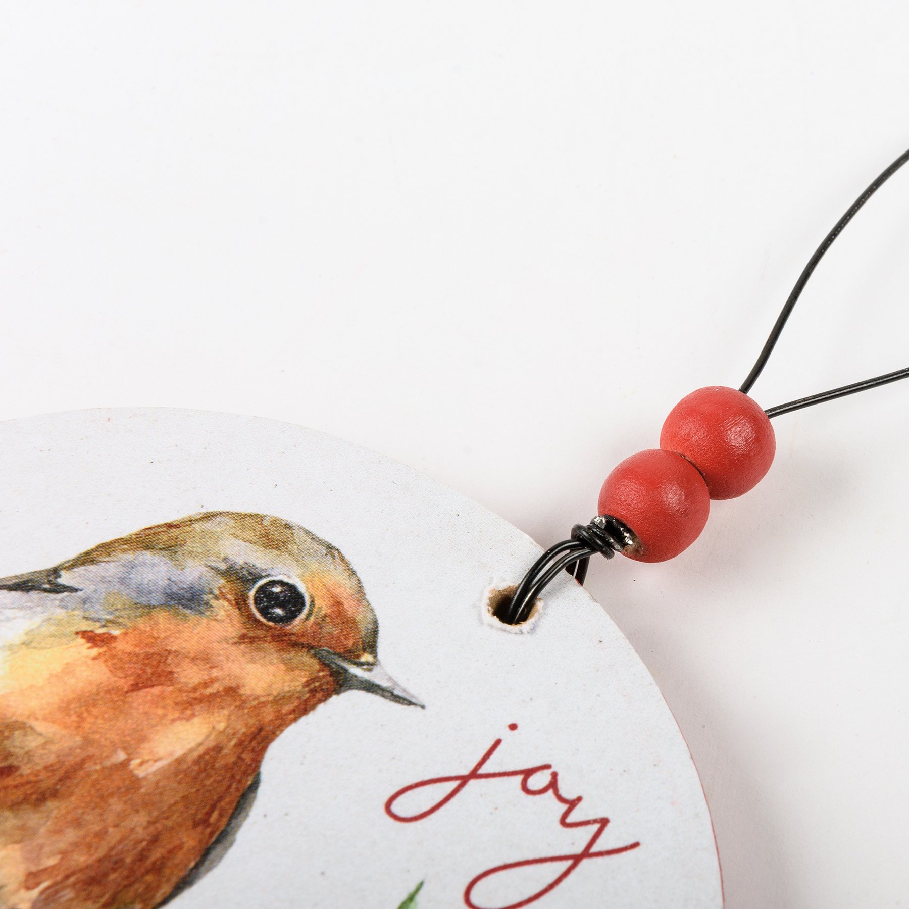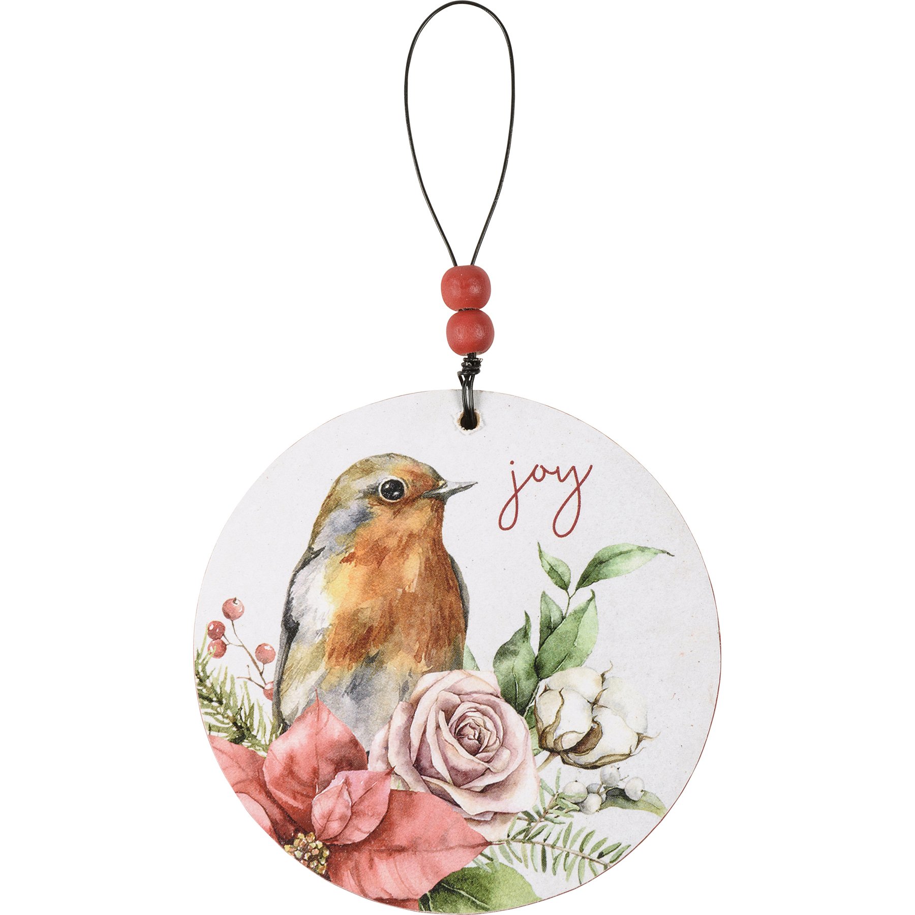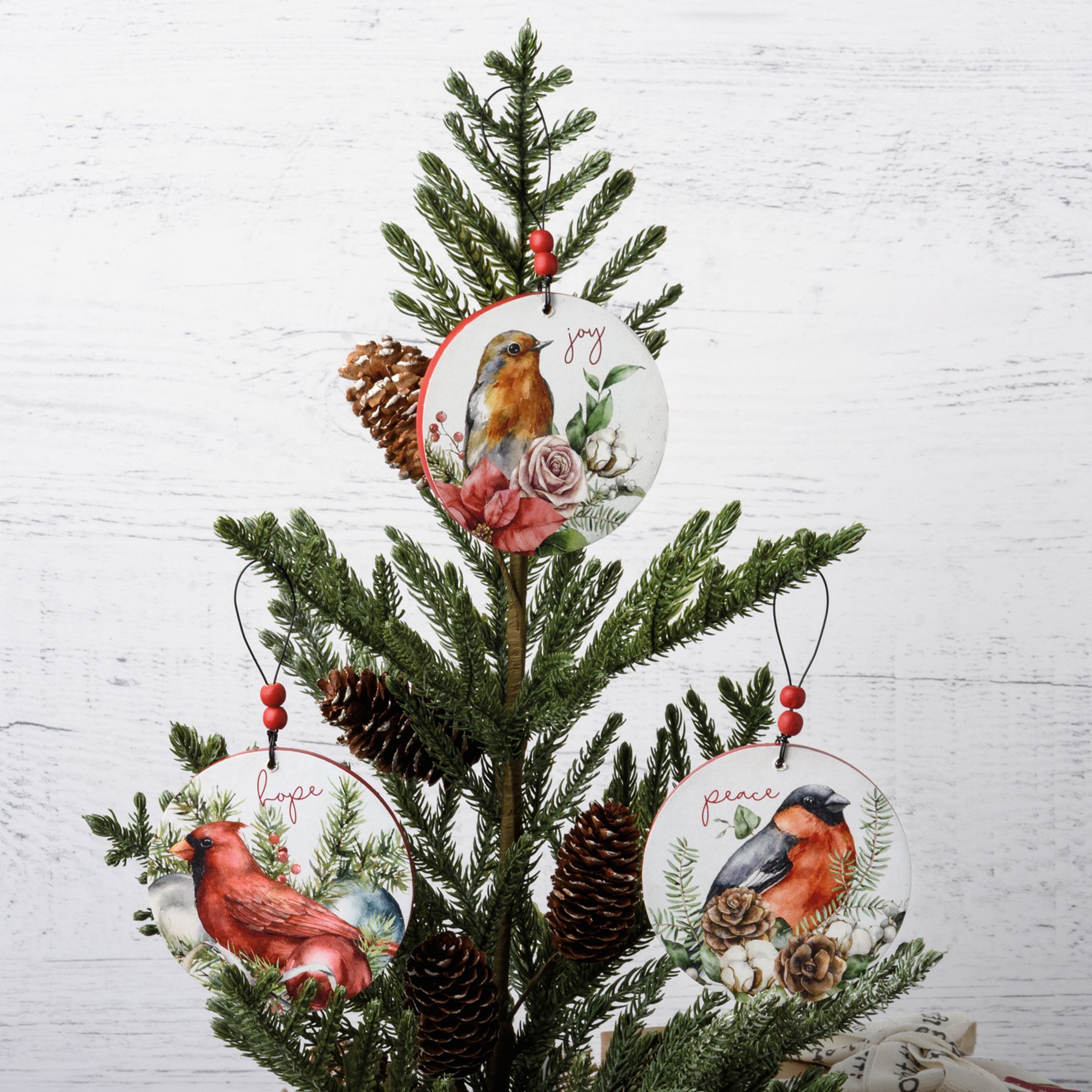 A set of three wooden Christmas ornaments featuring colorful watercolor bird and floral designs with "Peace," "Hope," and "Joy" sentiments. Our Birds Christmas ornaments easily hang via wire loop hangers. Hangers feature red beads for added interest.