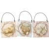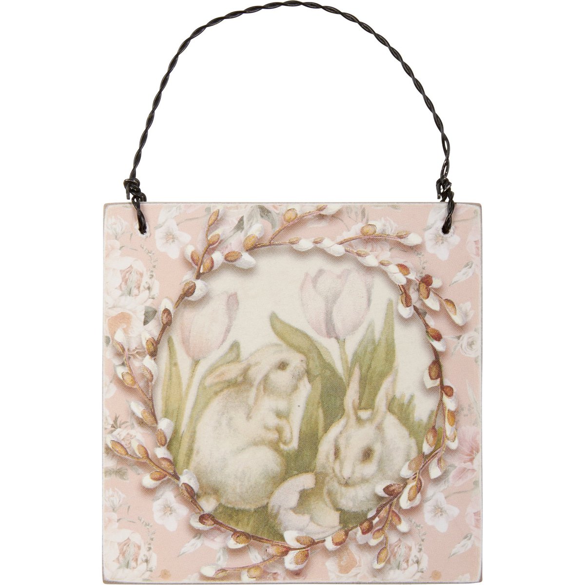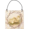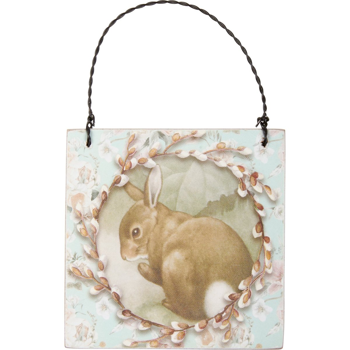 A set of three ornaments from our Easter & Spring Collection displaying unique vintage animal designs on each with coordinating soft floral patterns. Designs feature chicks, brown bunny, and white bunnies. Each ornament is easy to hang via twisted wire loop. Our Bunnies And Friends ornament set comes packaged in clear bag and tied with ribbon.