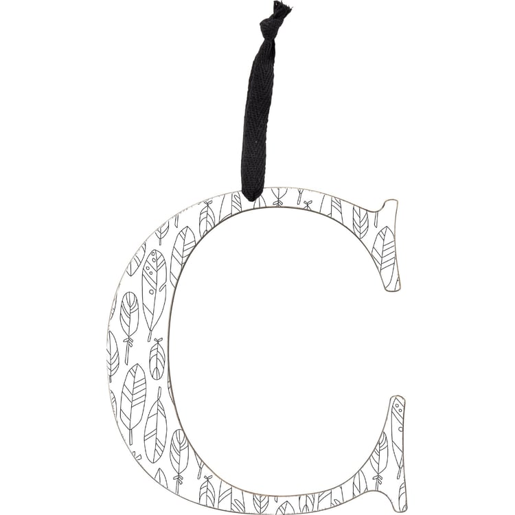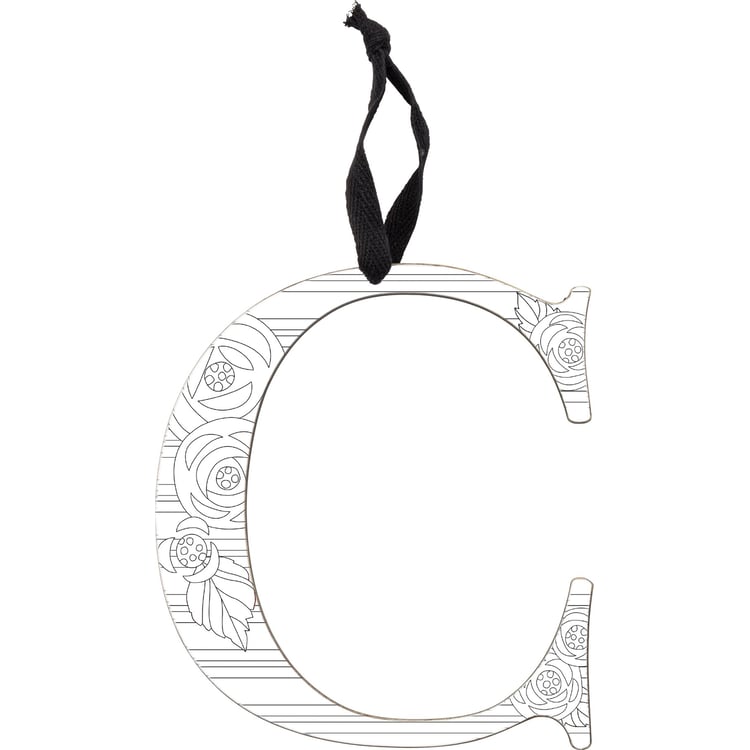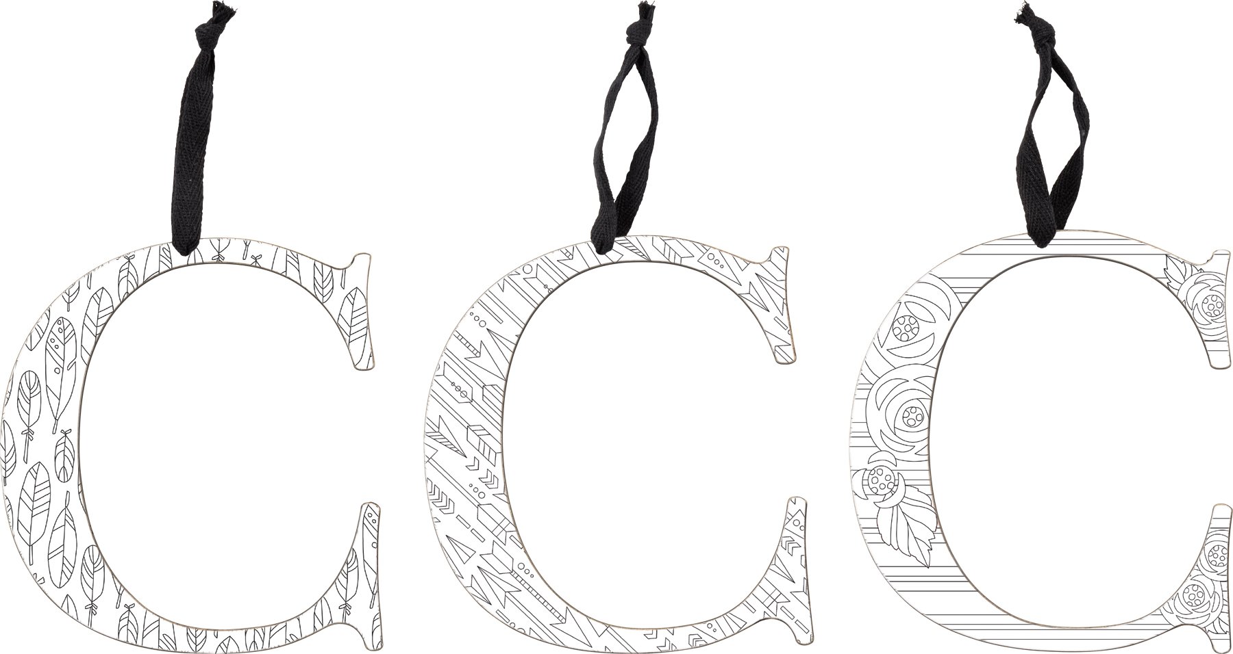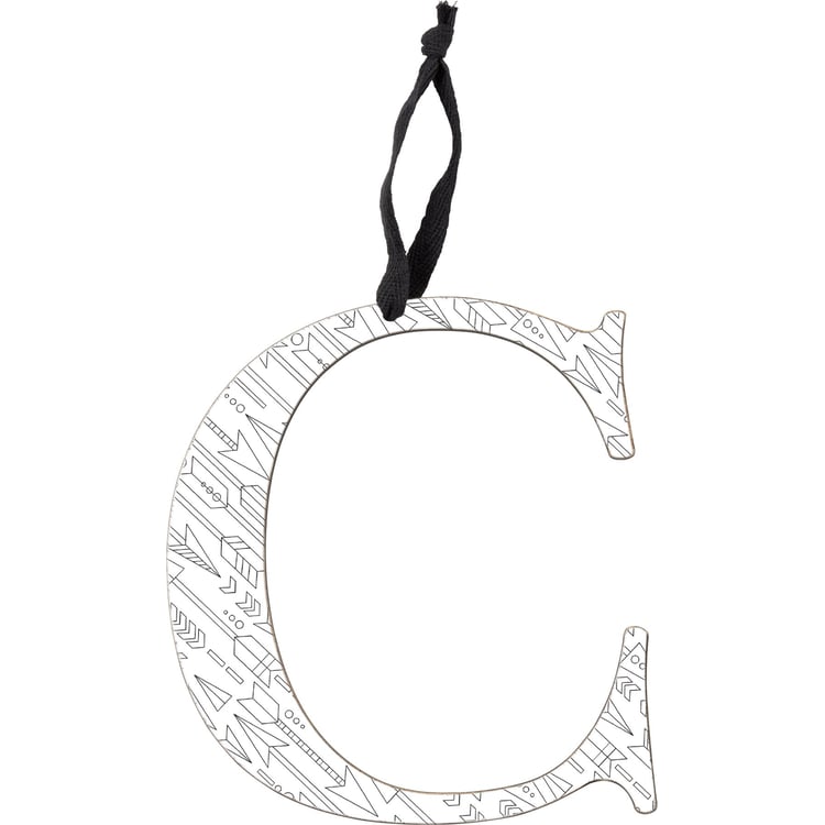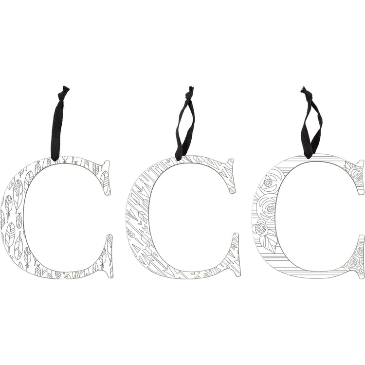 A set of wooden ornaments displaying a cutout letter "C" design with stylish black and white coloring book patterns that can be colored in with colored pencils or markers to add personal style! Letter ornament set features 3 letter "C" ornaments with one of each hand illustrated geometric pattern including feathers, arrows, and flowers with lines. Letter ornaments also feature coordinating black color on the sides and back. Each letter ornament is easy to hang via the attached black cotton tape hanger. A set of stylish home accents perfect for adding personality to everyday home decor.