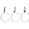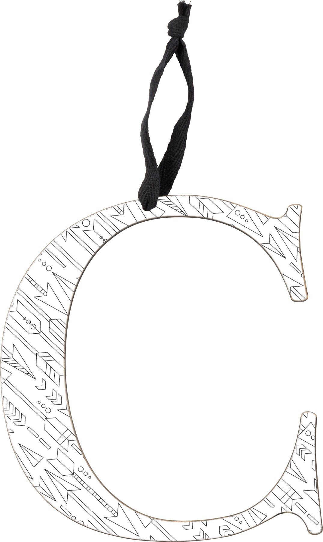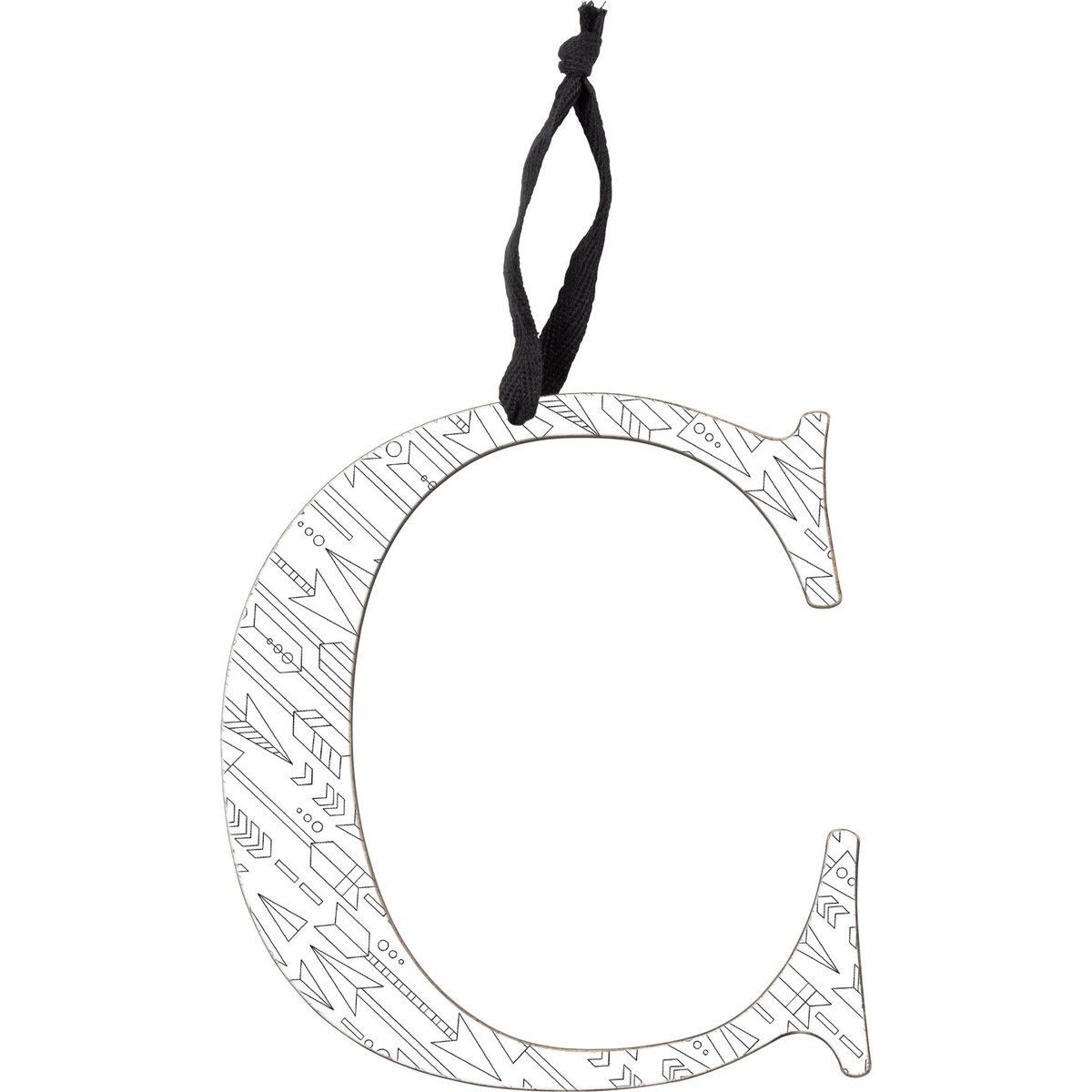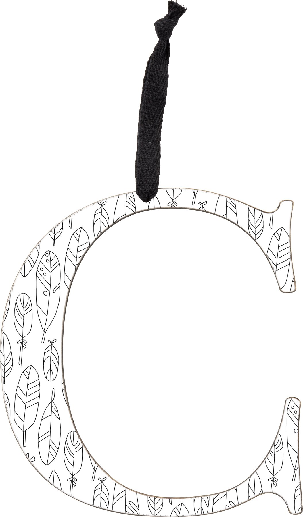 A set of wooden ornaments displaying a cutout letter "C" design with stylish black and white coloring book patterns that can be colored in with colored pencils or markers to add personal style! Letter ornament set features 3 letter "C" ornaments with one of each hand illustrated geometric pattern including feathers, arrows, and flowers with lines. Letter ornaments also feature coordinating black color on the sides and back. Each letter ornament is easy to hang via the attached black cotton tape hanger. A set of stylish home accents perfect for adding personality to everyday home decor.