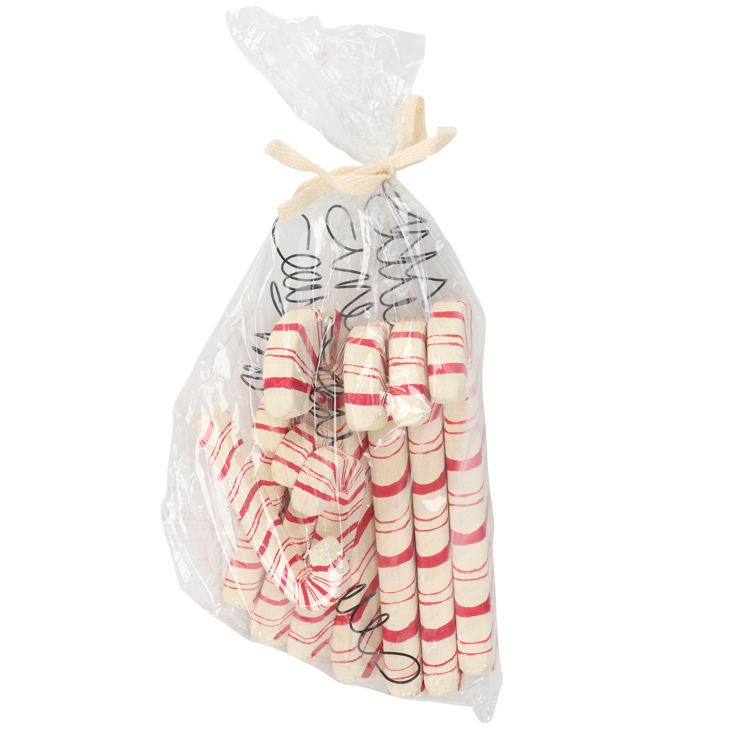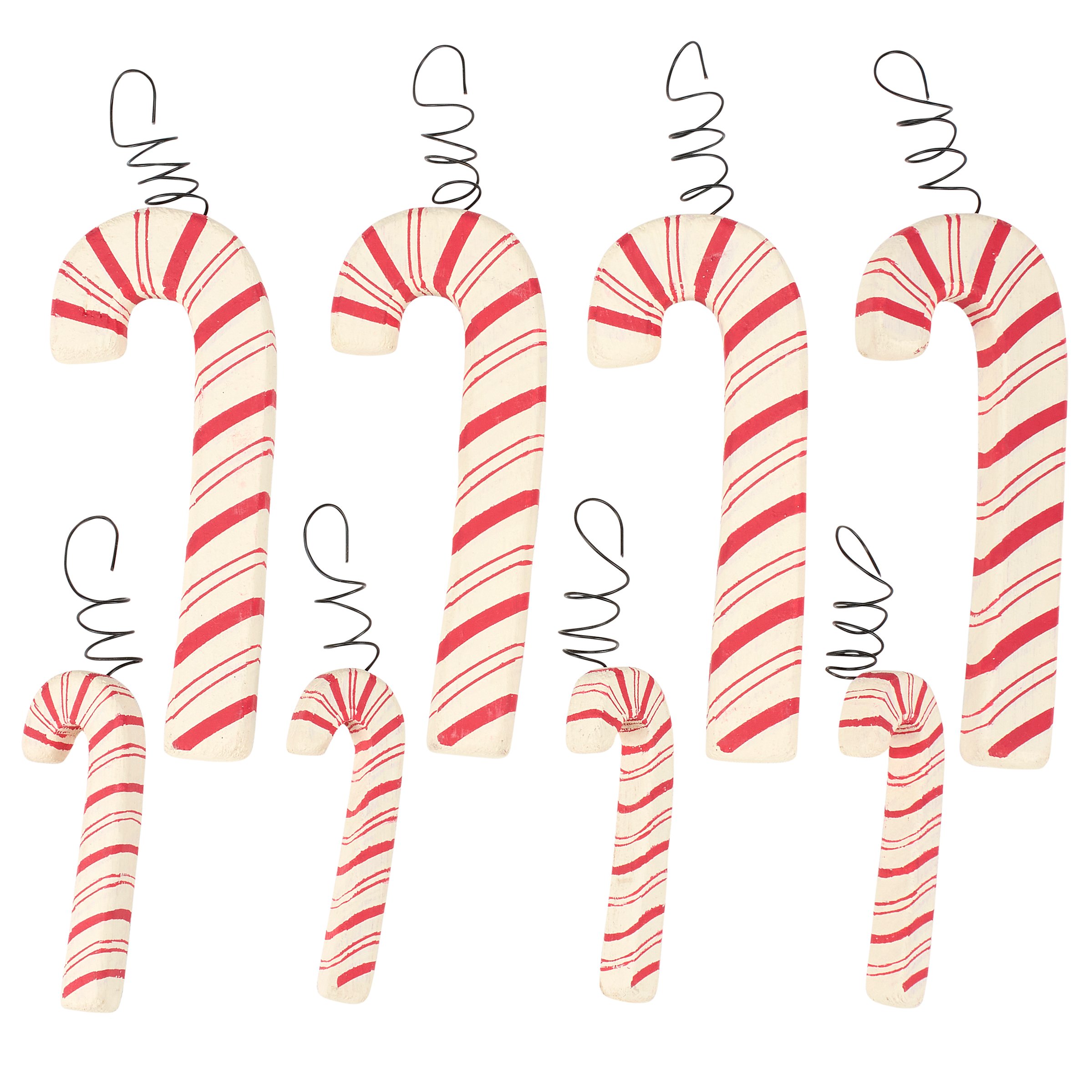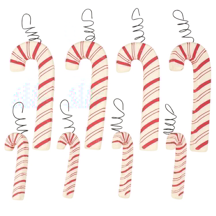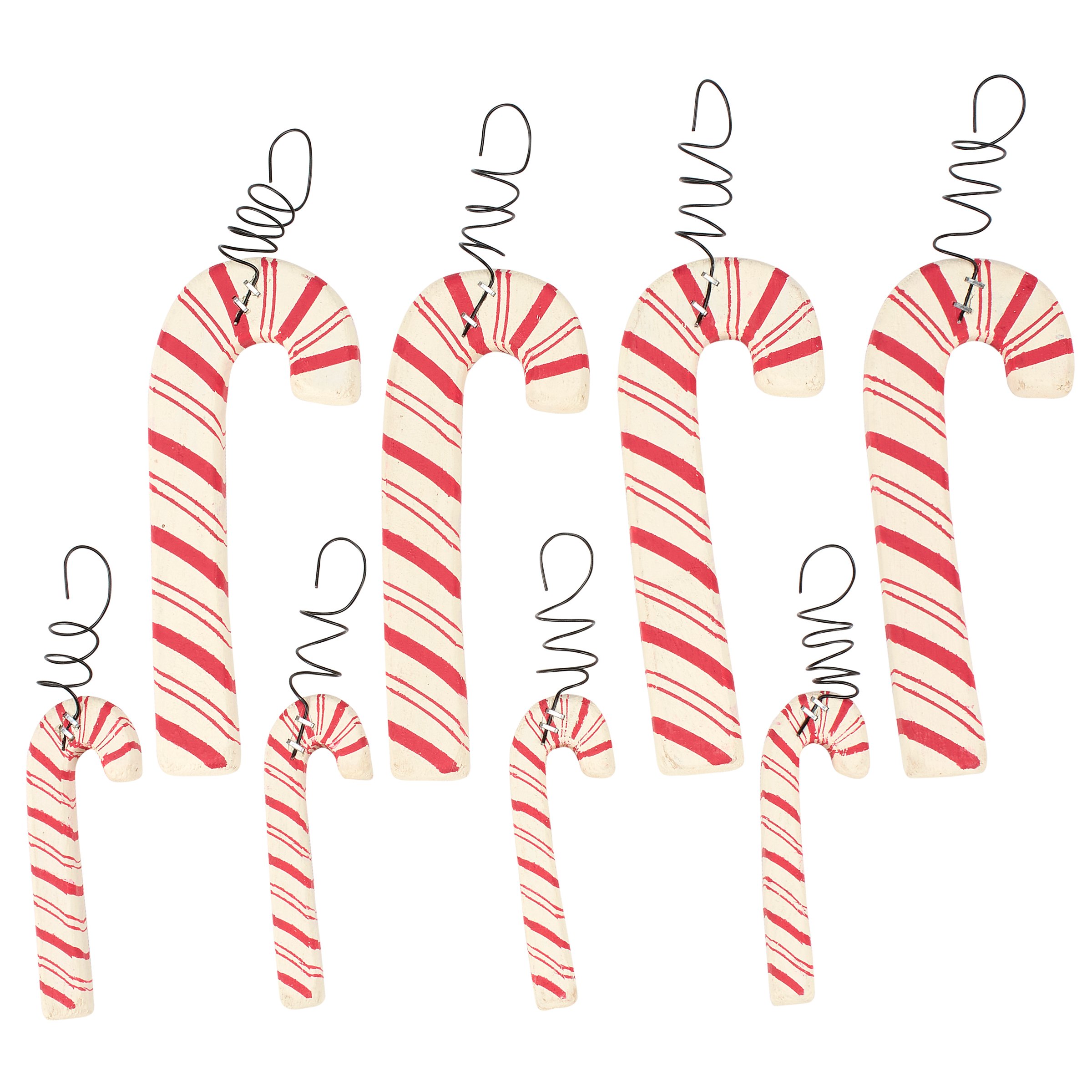 A set of 8 candy cane ornaments from our Christmas Collection displaying rustic inspired red and white stripes painted on natural wood with distressed details for a naturally aged appearance. Includes 4 of each size candy cane ornament and each one features a sturdy twisted wire hanger to easily hang on a Christmas tree or to add subtle holiday style in any space. Our Candy Canes ornament set is packaged together in a poly bag finished with white ribbon. A set of rustic home accents perfect for Christmas tree decorating or for gifting.