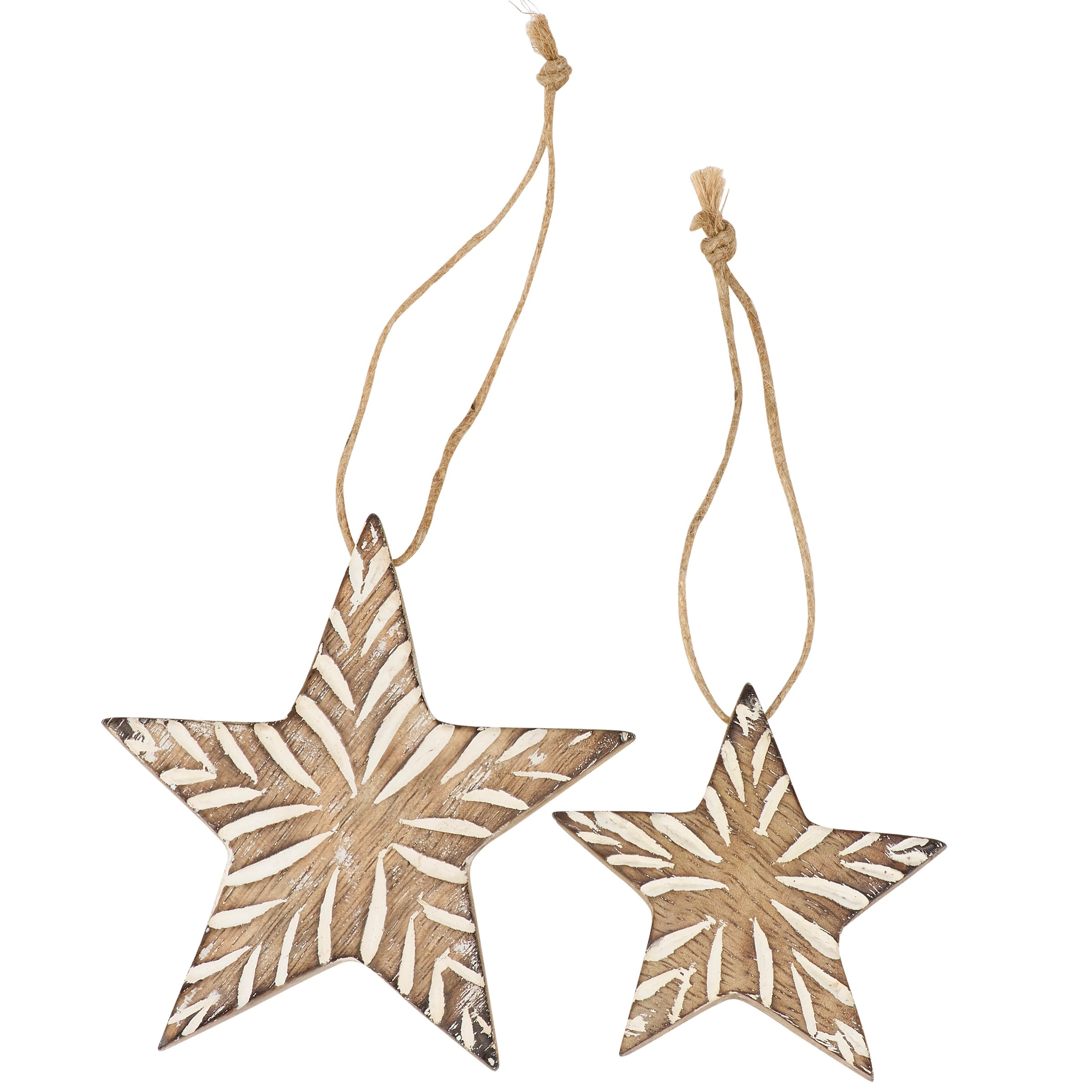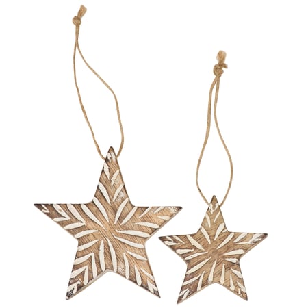 A set of wooden ornaments from our Christmas Collection featuring 2 different size star shaped ornaments with carved details and painted accents. Our Carved Stars ornament set is ready to hang via the attached just hangers. A set of natural Christmas home accents perfect for seasonal decorating.